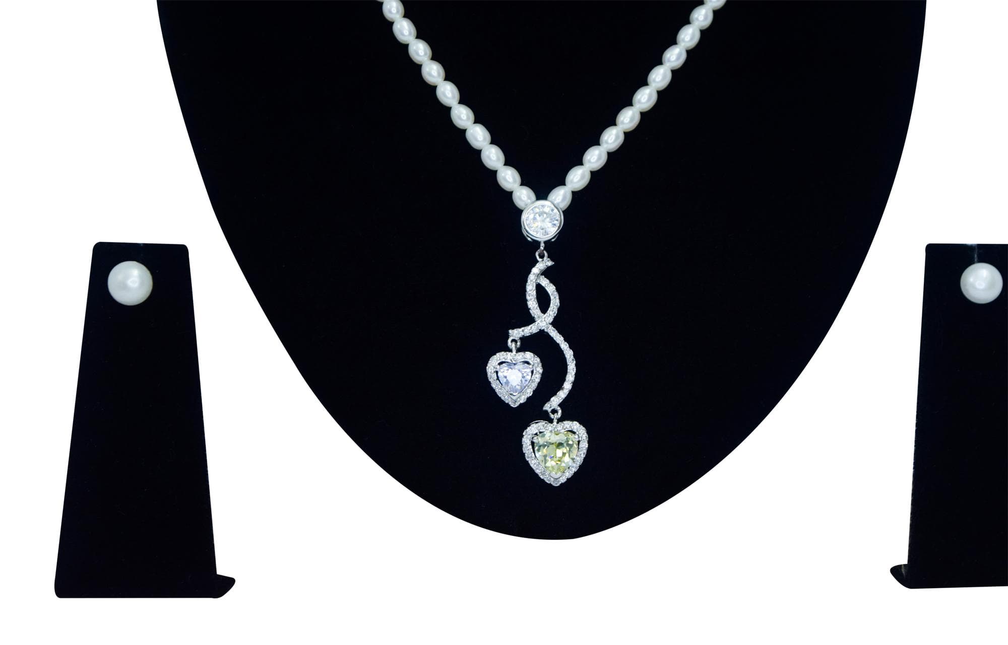 Finely crafted oval white pearl necklace set with a zircon studded pendant with hearts.