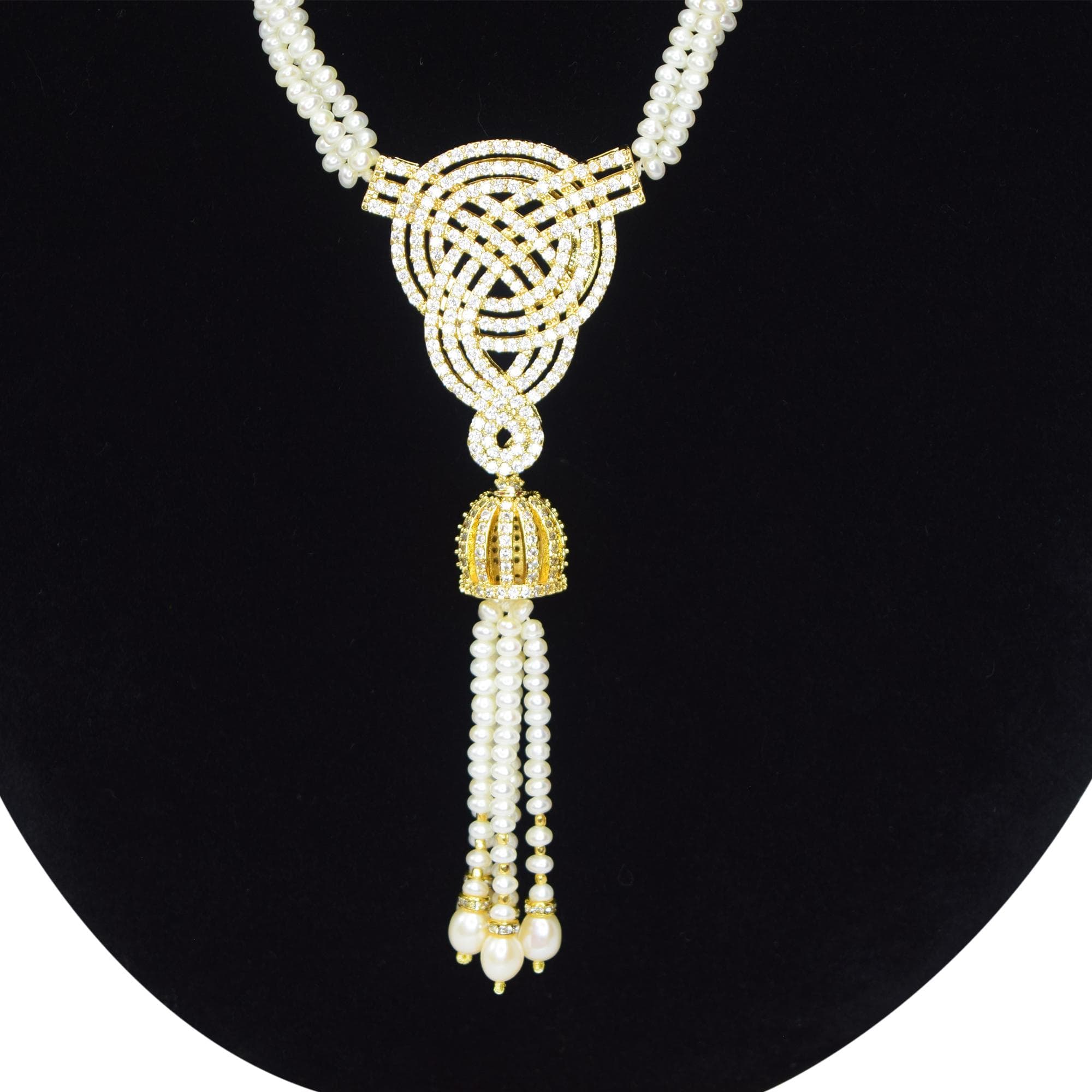 Alluring 3 Lines Luxury Pearl Necklace with Weave Pattern AD Pendant