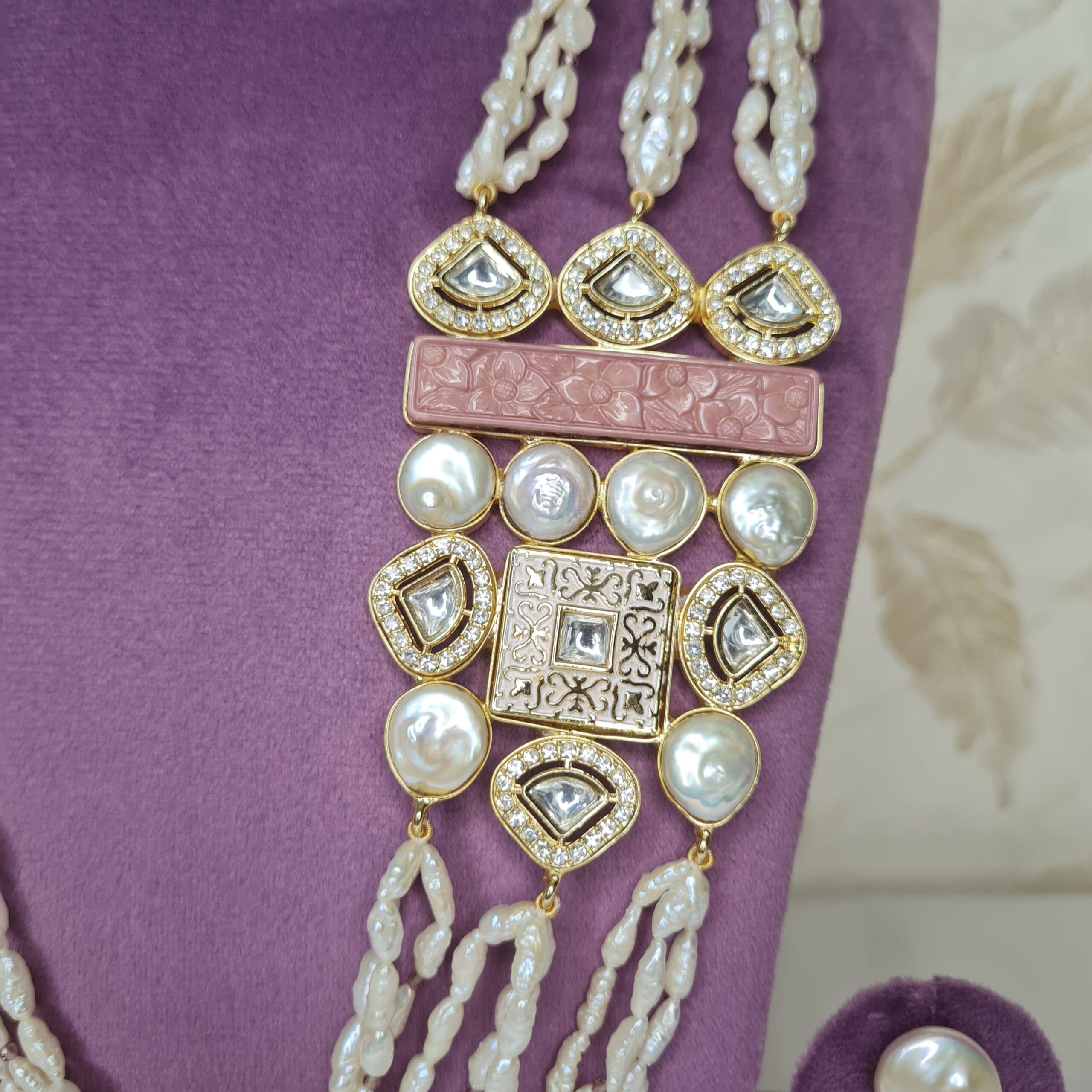 This is a classic rectangular pendant studded with Kundan's, CZ's, baroque pearls & a beautifully carved stone.