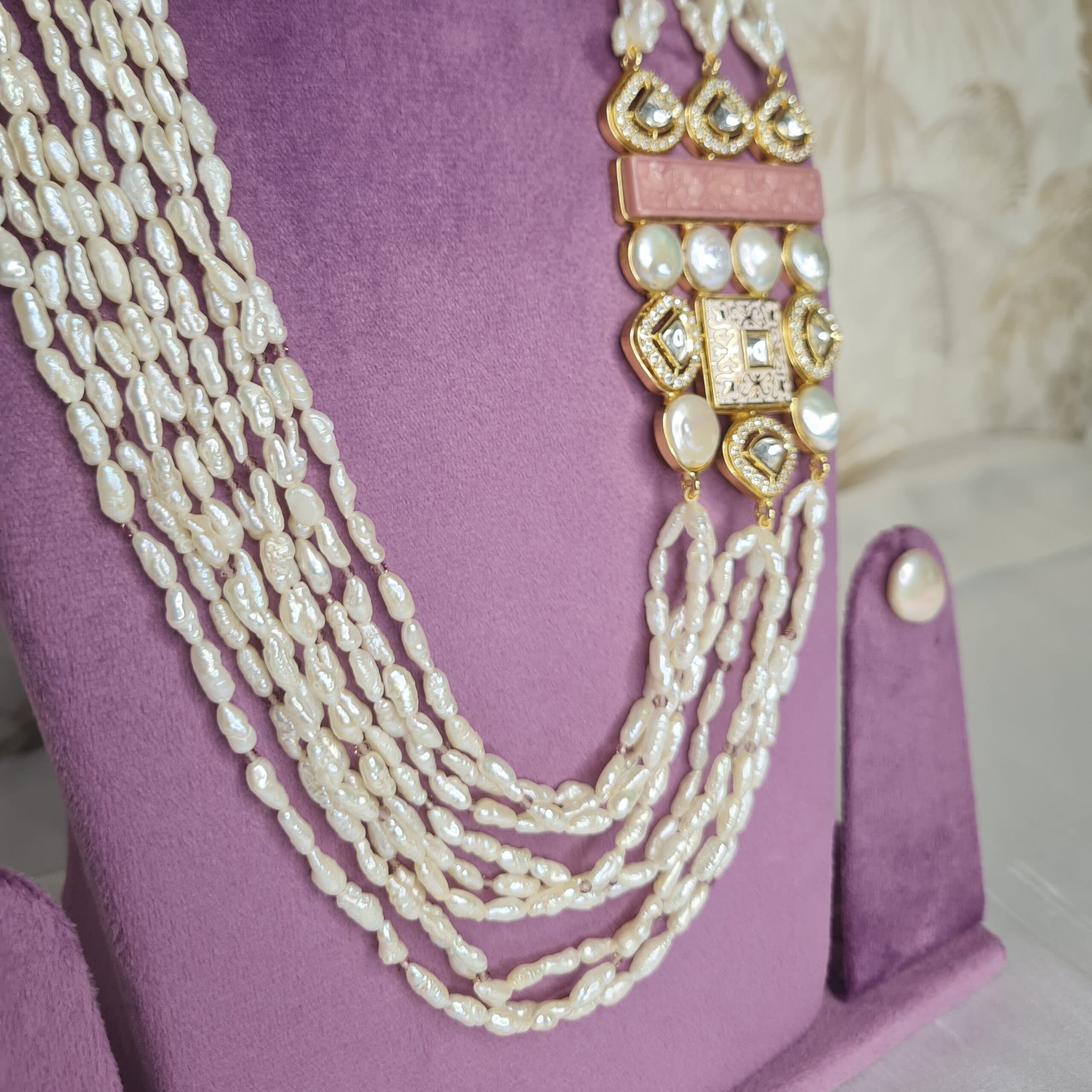 A limited edition artistic multi-row statement necklace made with nine strands of long white baroque pearls attached to a fusion Kundan & CZ pendant.
