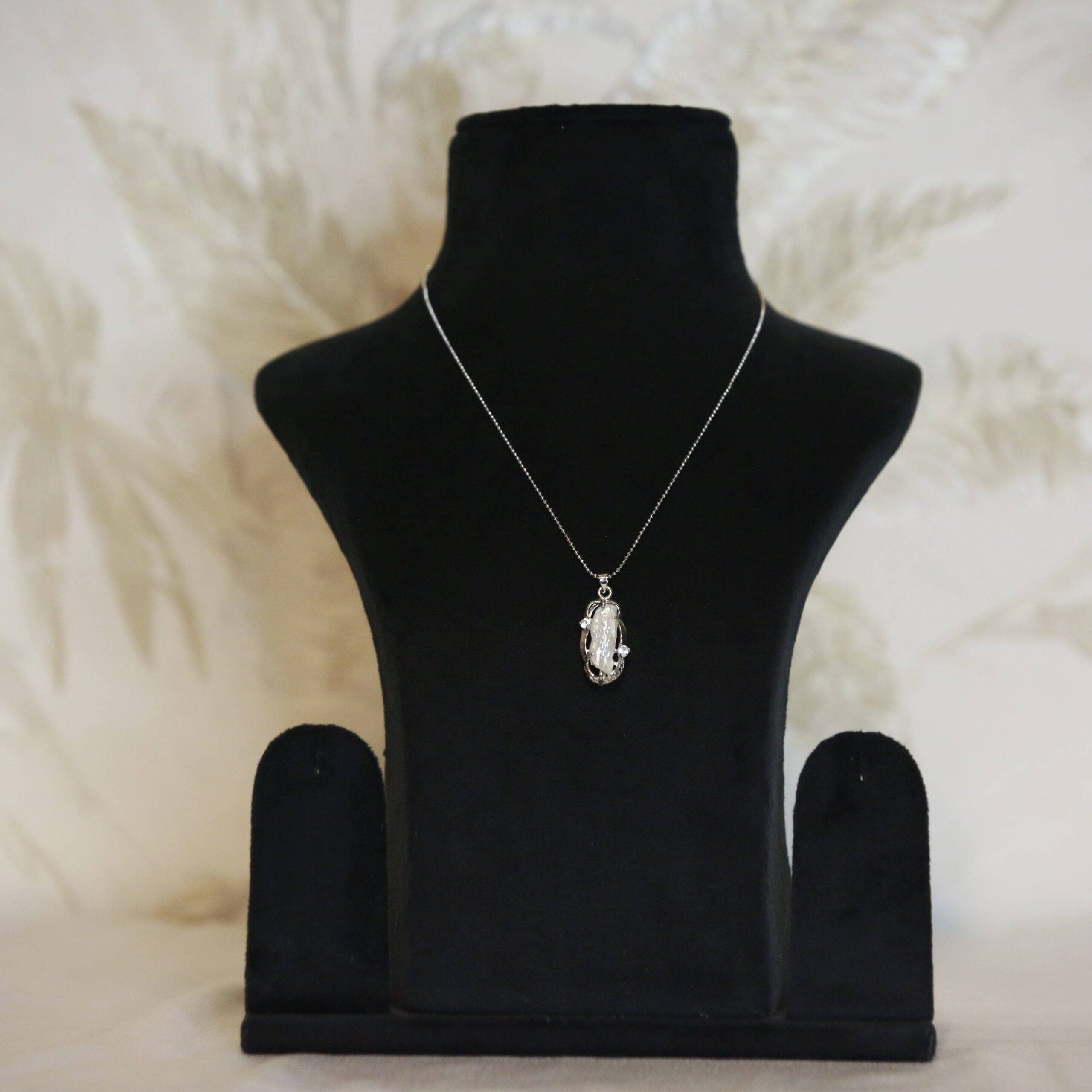 A sleek pendant studded with a white baroque pearl that can make any look classy and elegant.