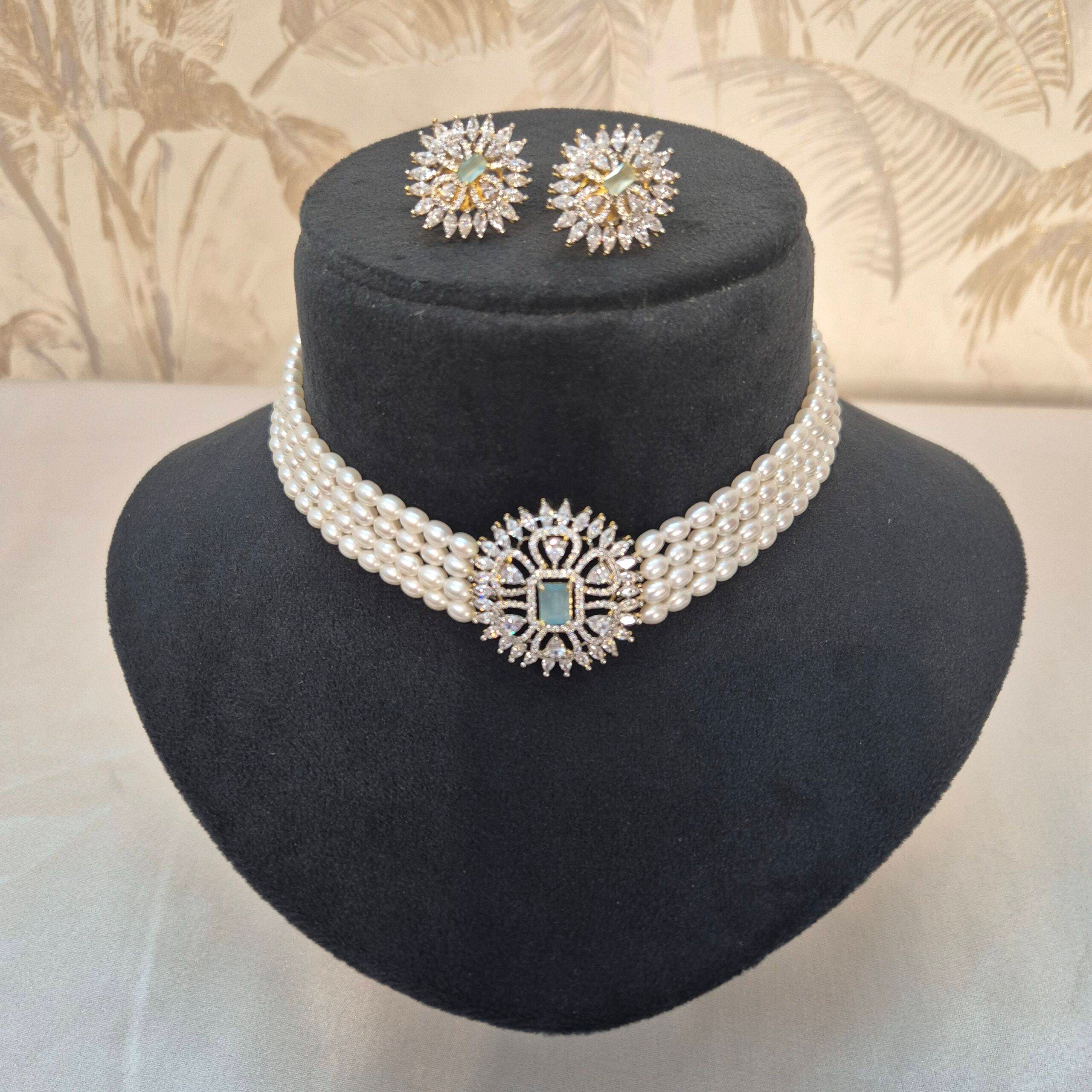 Handmade four-line choker made with subtle 4mm white oval pearls attached to an elegant pendant studded with shiny zircons & pastel green CZ.