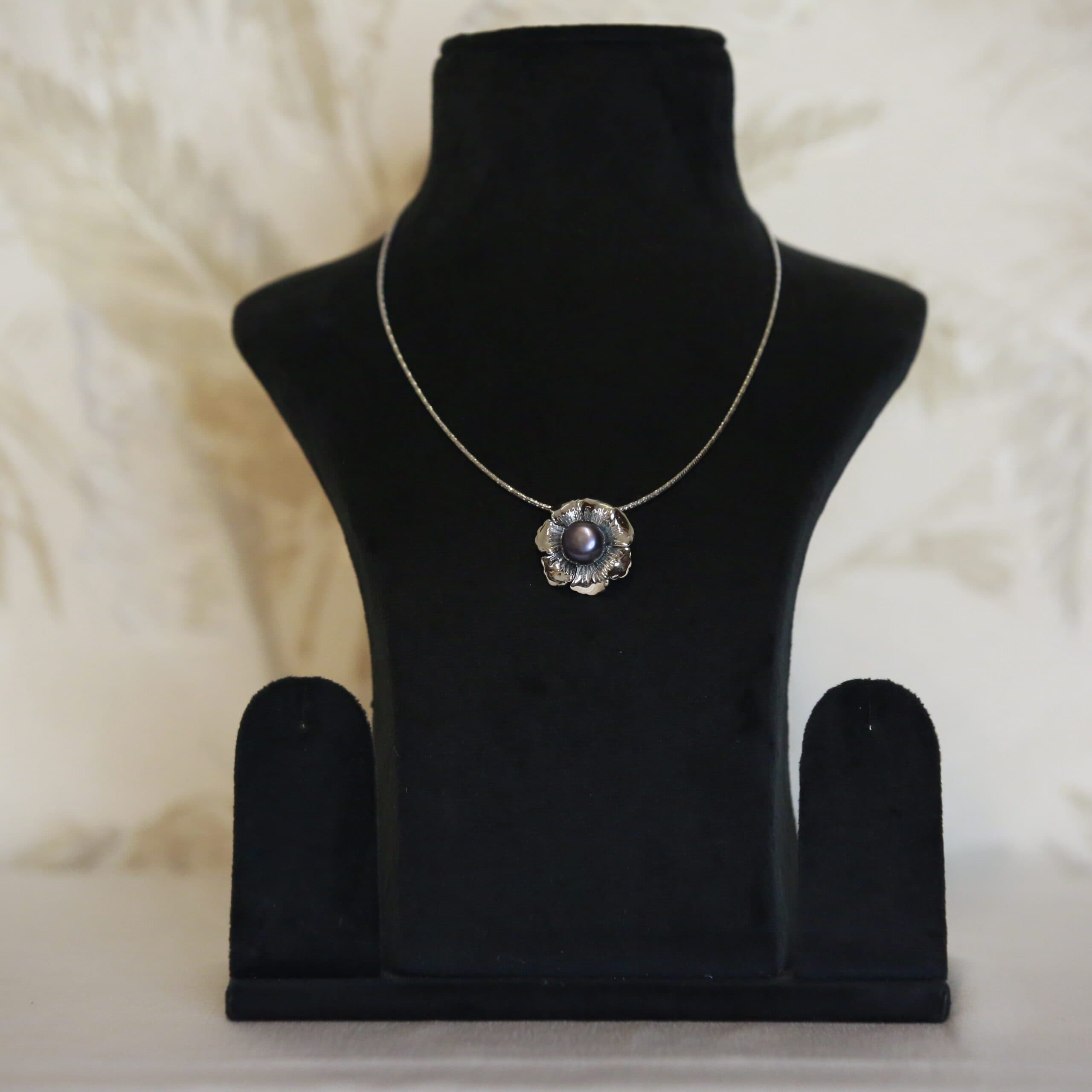 A stylish single flower-shaped pendant studded with a 12mm button pearl that makes any look classy.