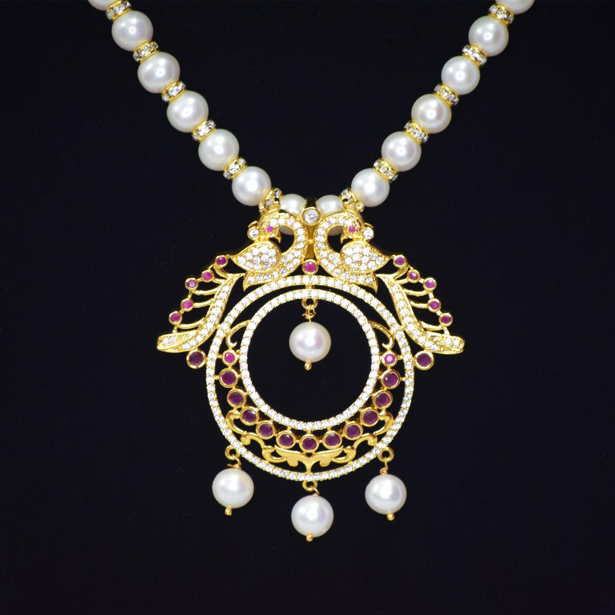 This pendant is studded with many tiny zircon stones & tiny red crystals surrounded by beautiful filigree work & zircon stones all around with pearl drops.