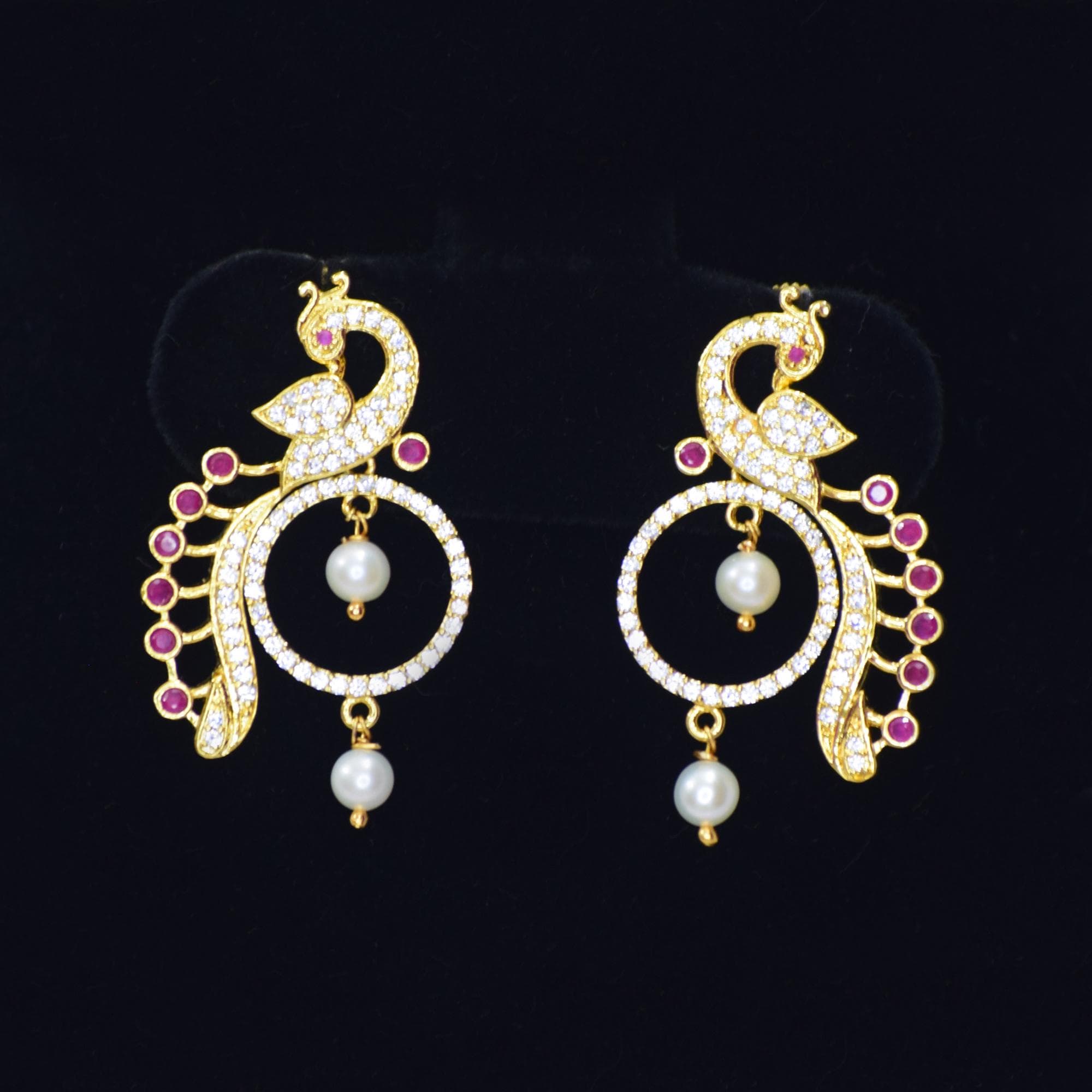 The pretty Peacock earrings are embellished with shiny zircons & red crystals with a pearl drop.