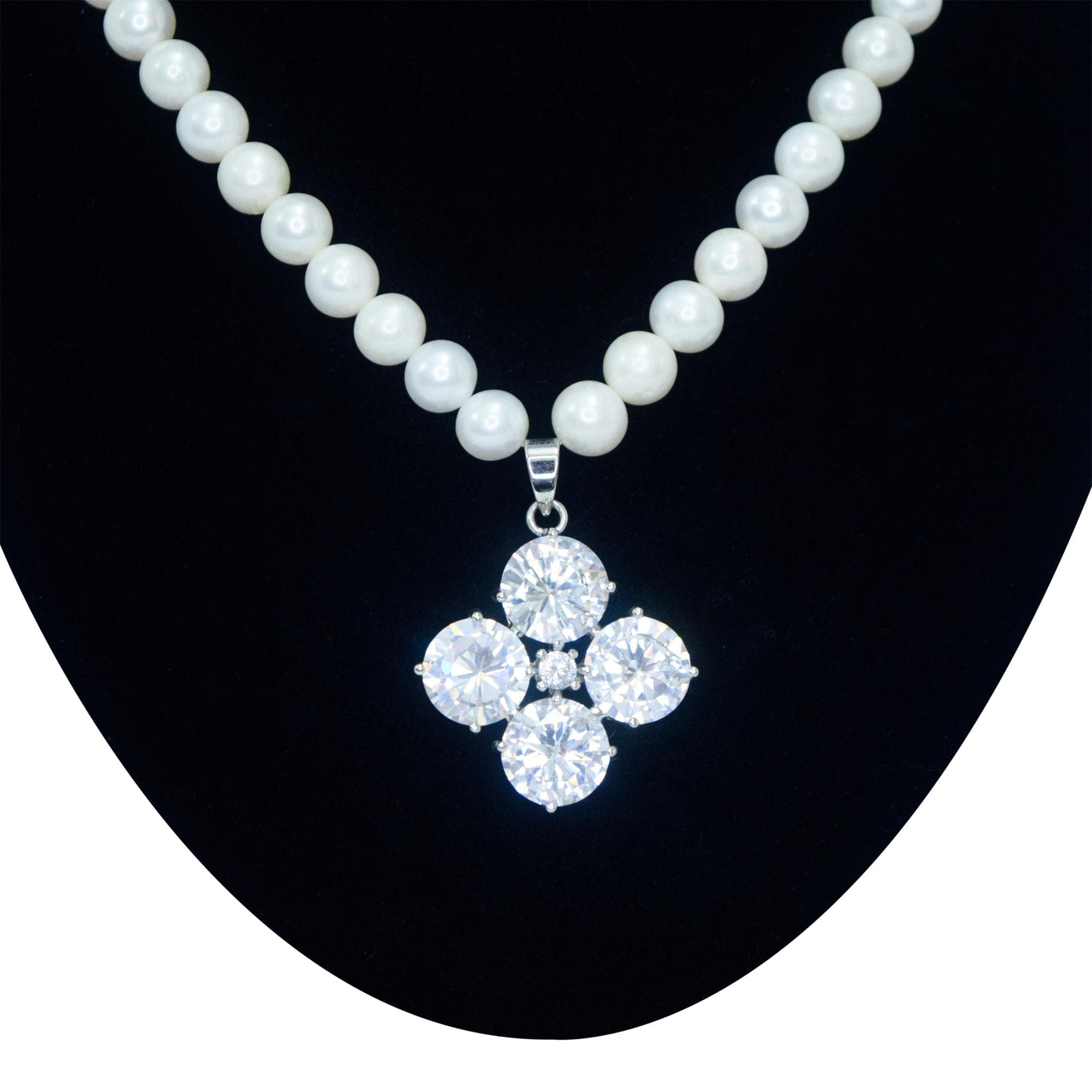 Beautiful white pearl necklace featuring brilliantly shimmering crystal-studded pendant.
