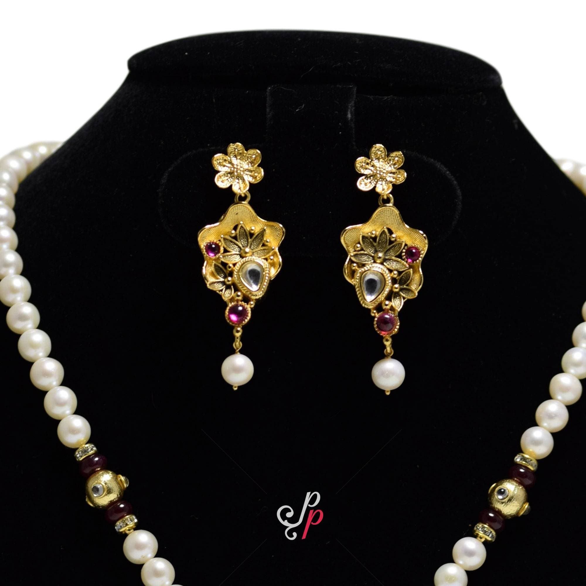They are studded with beautiful and high quality kundans and small dark pink kemp stones. The pearl hs hung to the pendant and earrings are real and guaranteed just like the ones in the necklace.