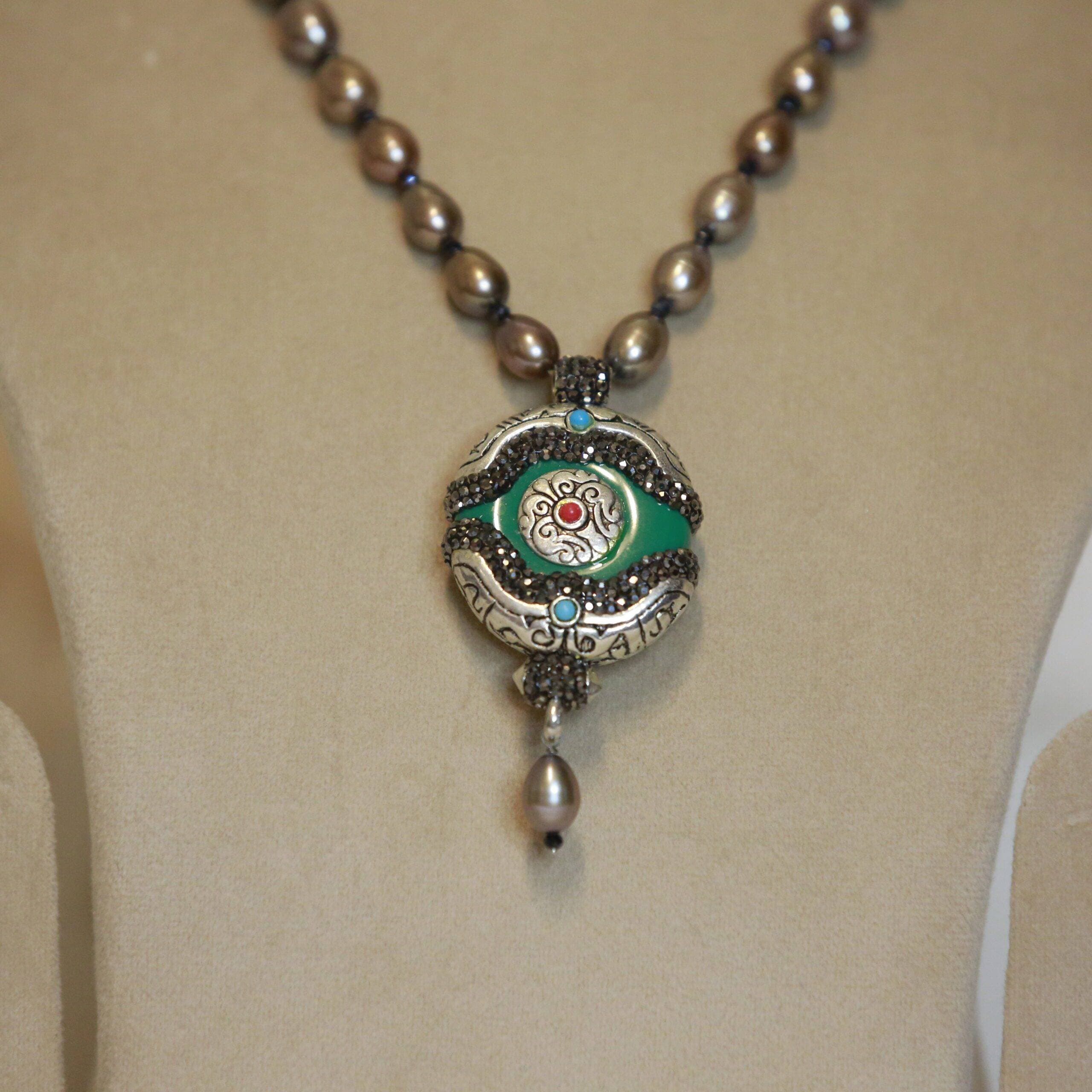 A contemporary 19-inch long light brown-coloured 8 mm oval pearls necklace attached to a vintage Tibetan green stone pendant.