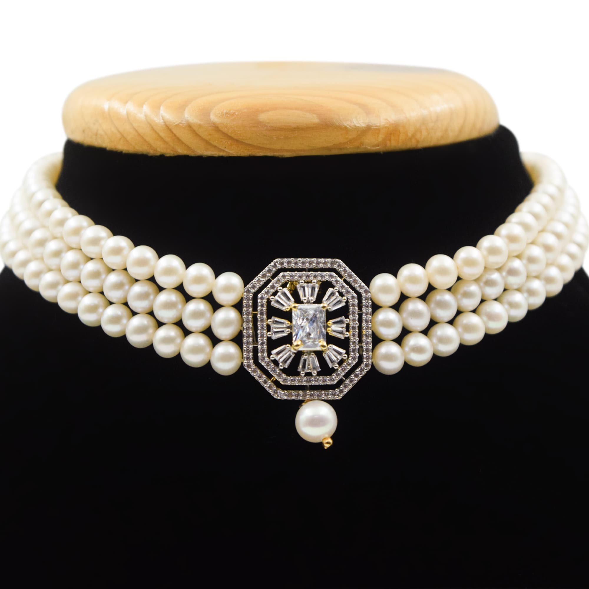 Classic Three Line White Round Pearls Choker With Geometric CZ Pendant