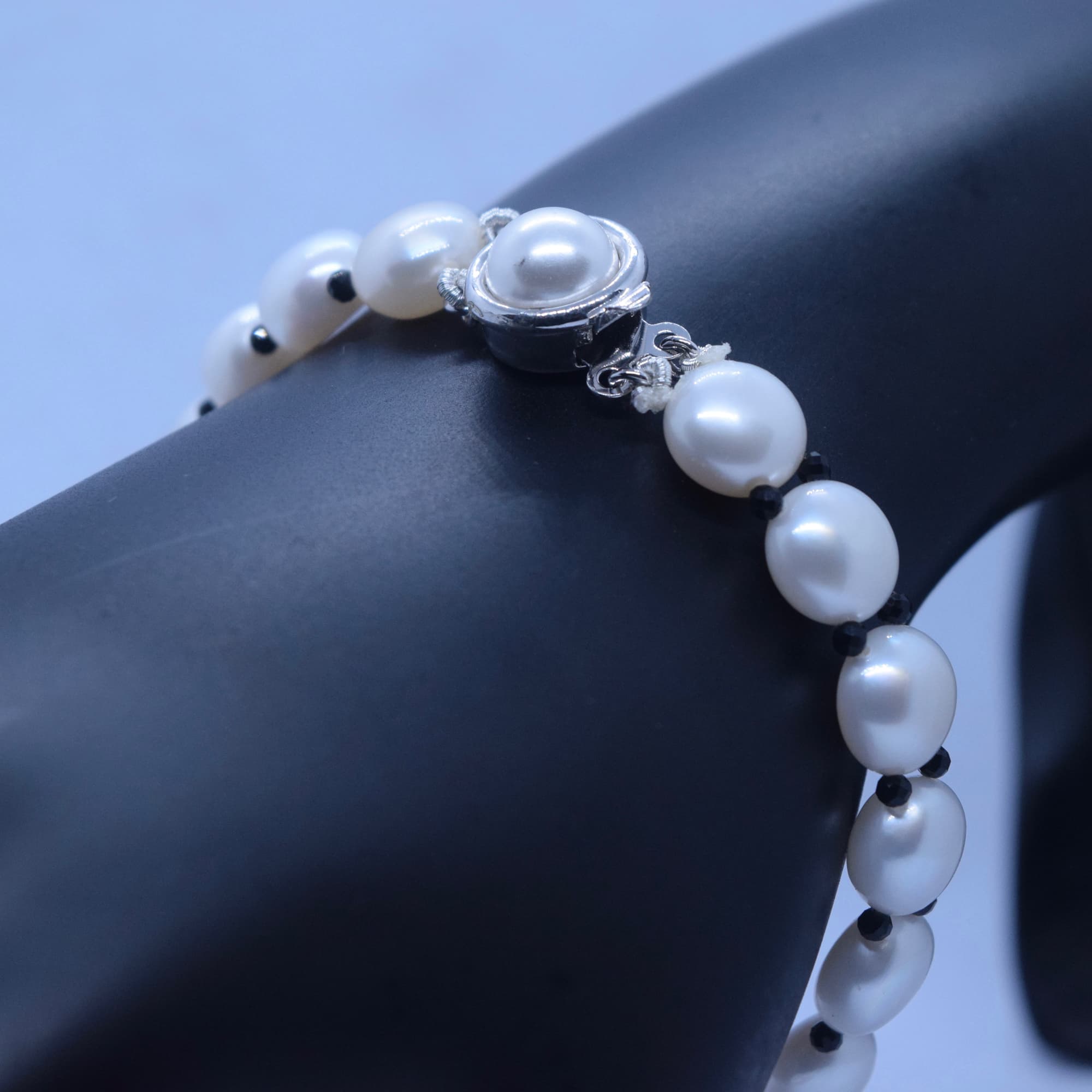Classy White Button Pearls Bracelet With Black CZ Crystals