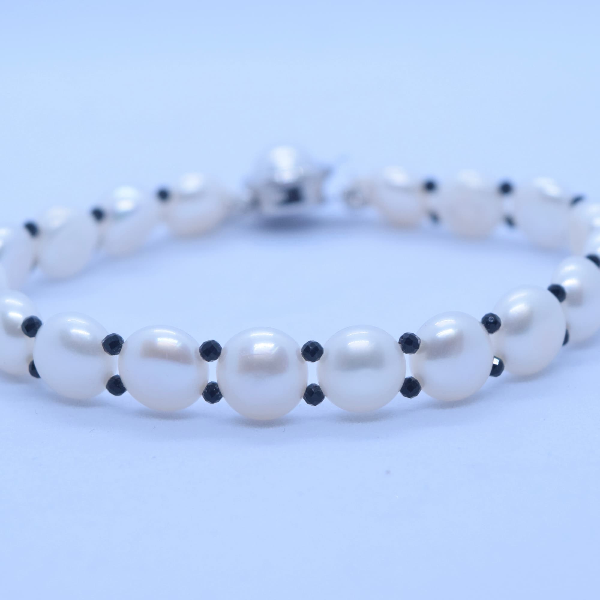 Finely crafted white button pearls interspaced with black shiny CZ crystals form this one of a kind bracelet, accentuated by silver finish clasp.
