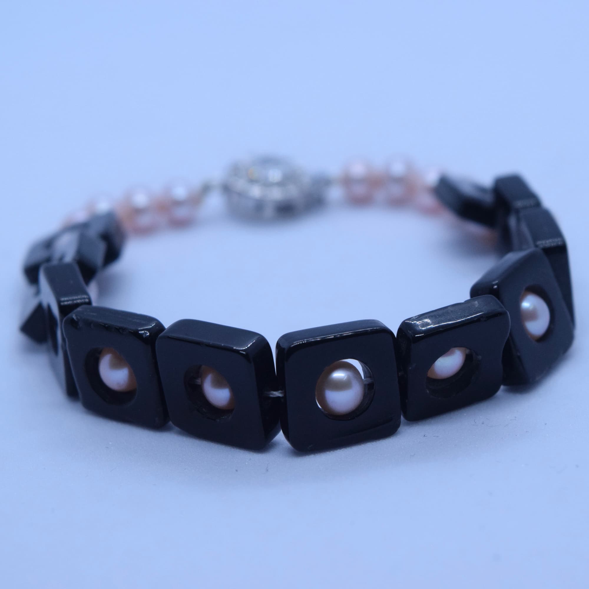 A cool & smart bracelet featuring 5mm round pink pearls fitted into black acrylic shiny square blocks accentuated with a silver finish clasp.