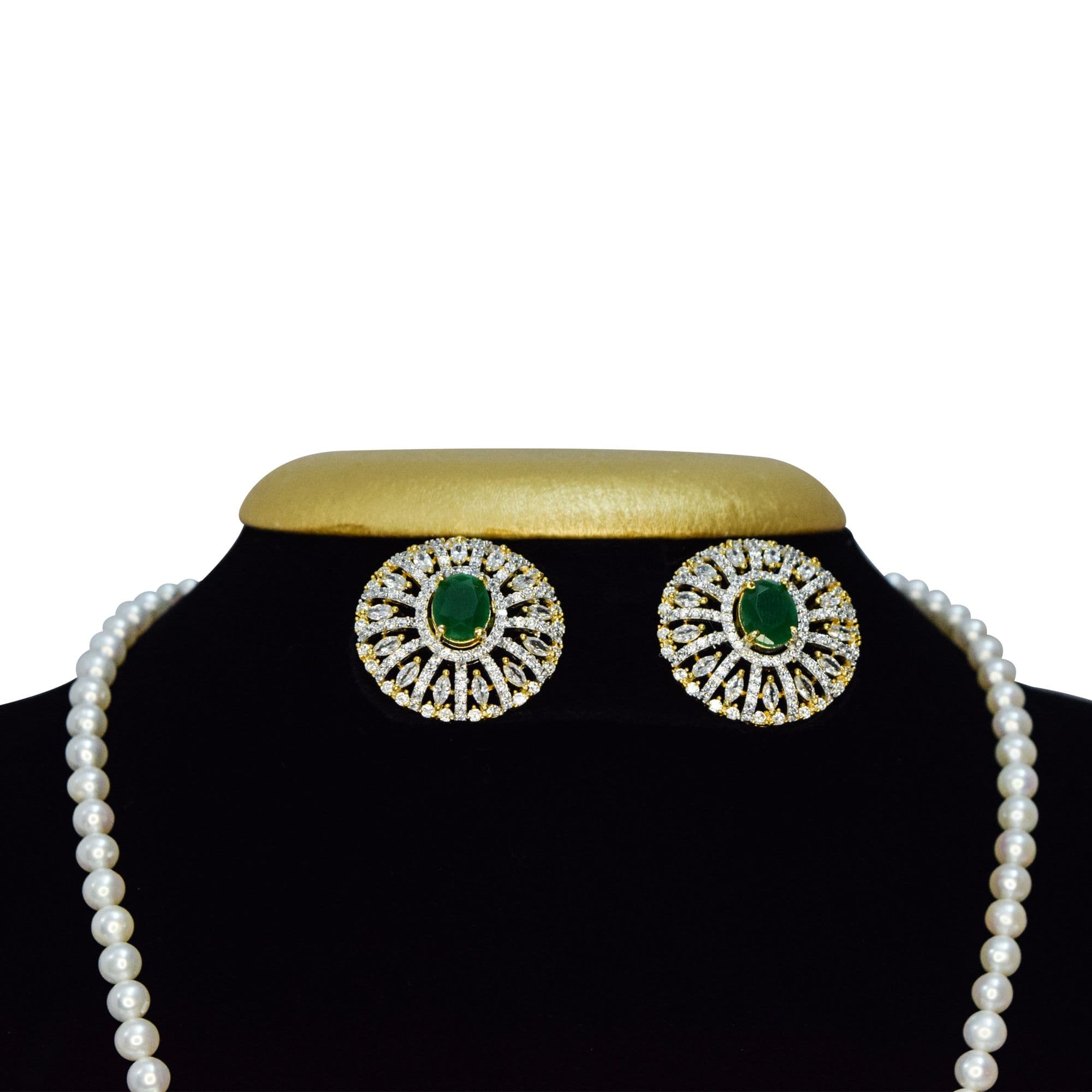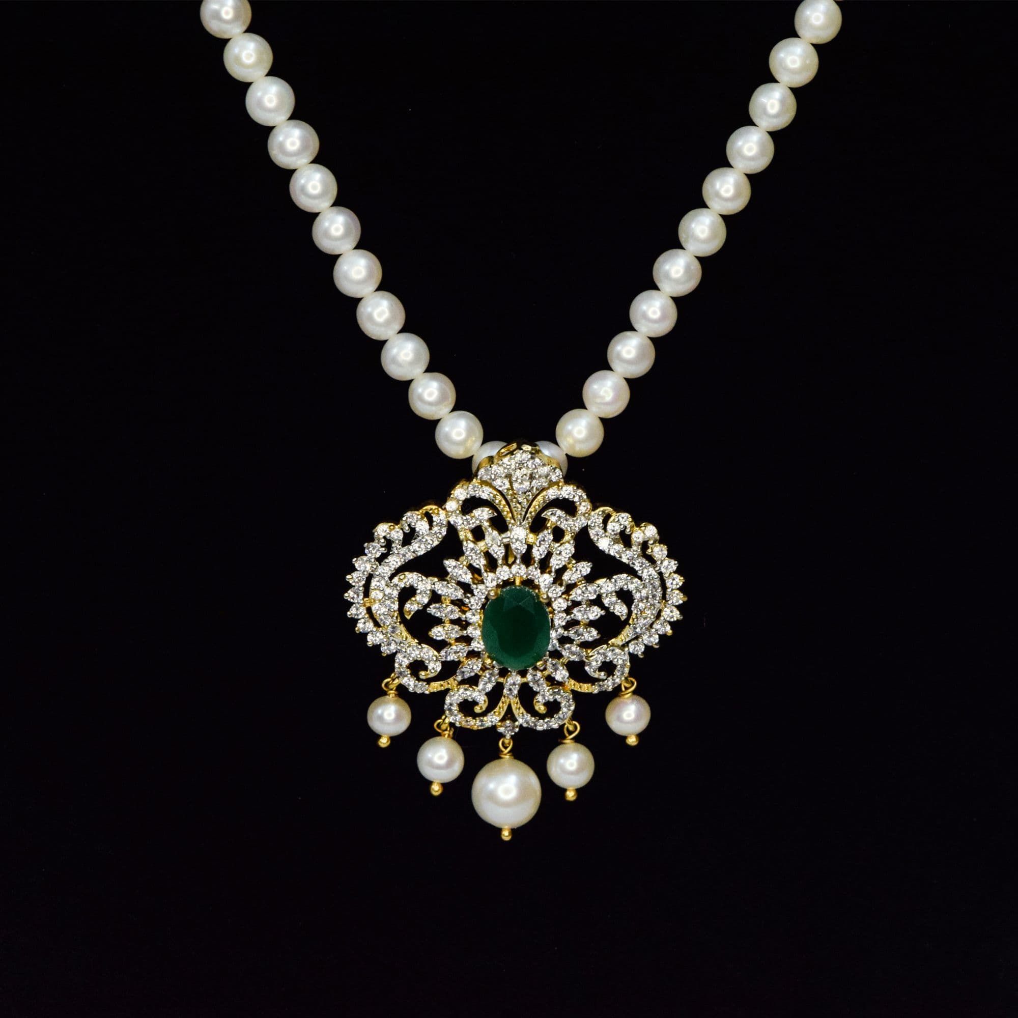 Bright 5mm round white pearls necklace with an artistic CZ studded peacock pendant with SP Emerald in the centre.
