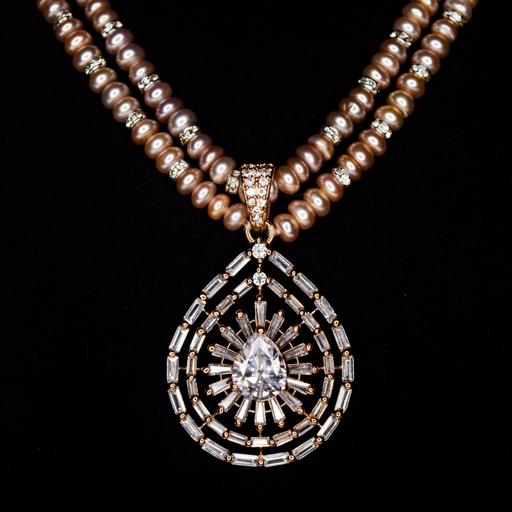 Limited Edition featuring finely crafted dual-layer lavender semi-round pearls necklace with silver finish zircon roundels attached to a starry tear drop Zircon studded pendant.