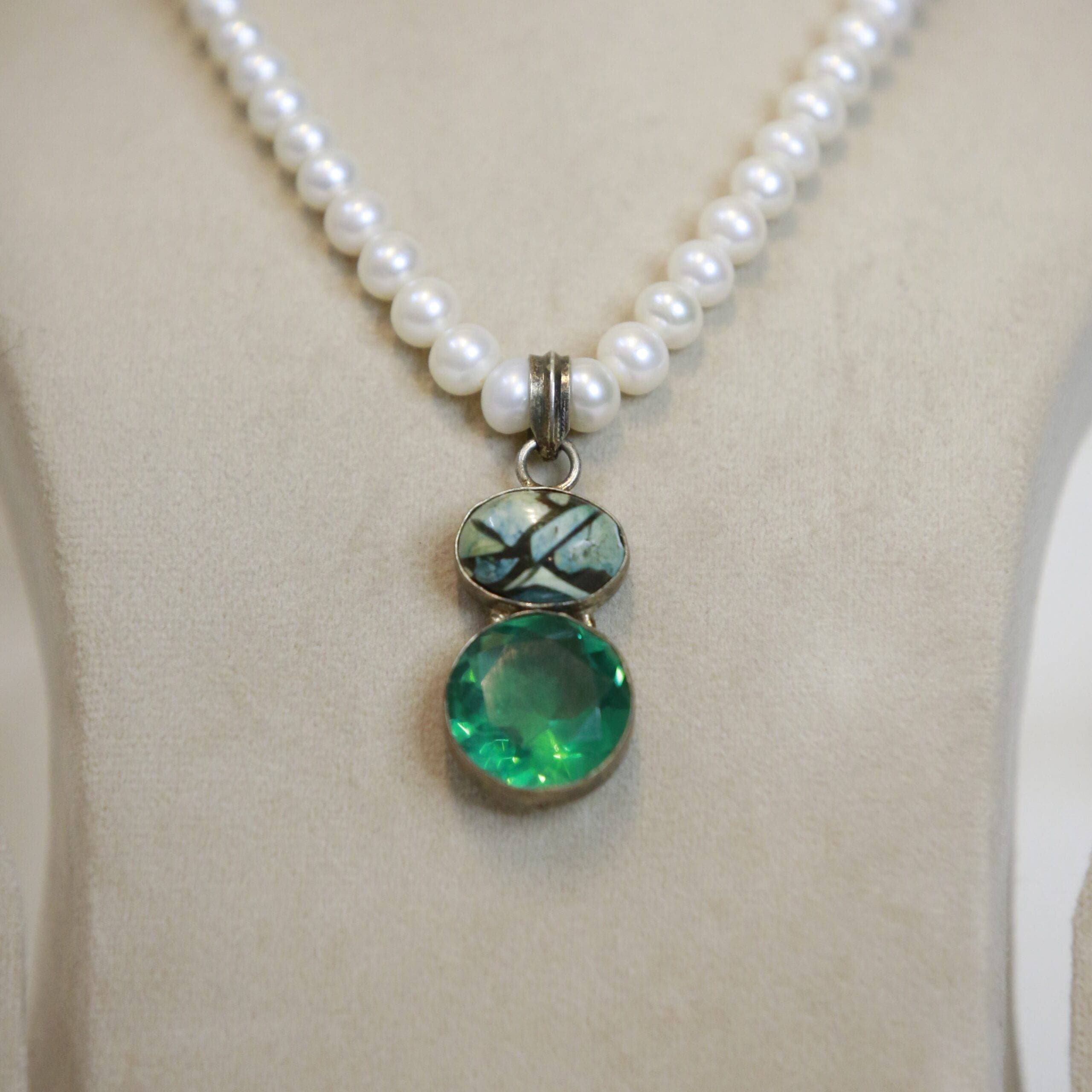 Beautiful single-line white round pearl necklace , graduated from 4mm to 8mm accentuated by a pure silver pendant studded with a green onyx.
