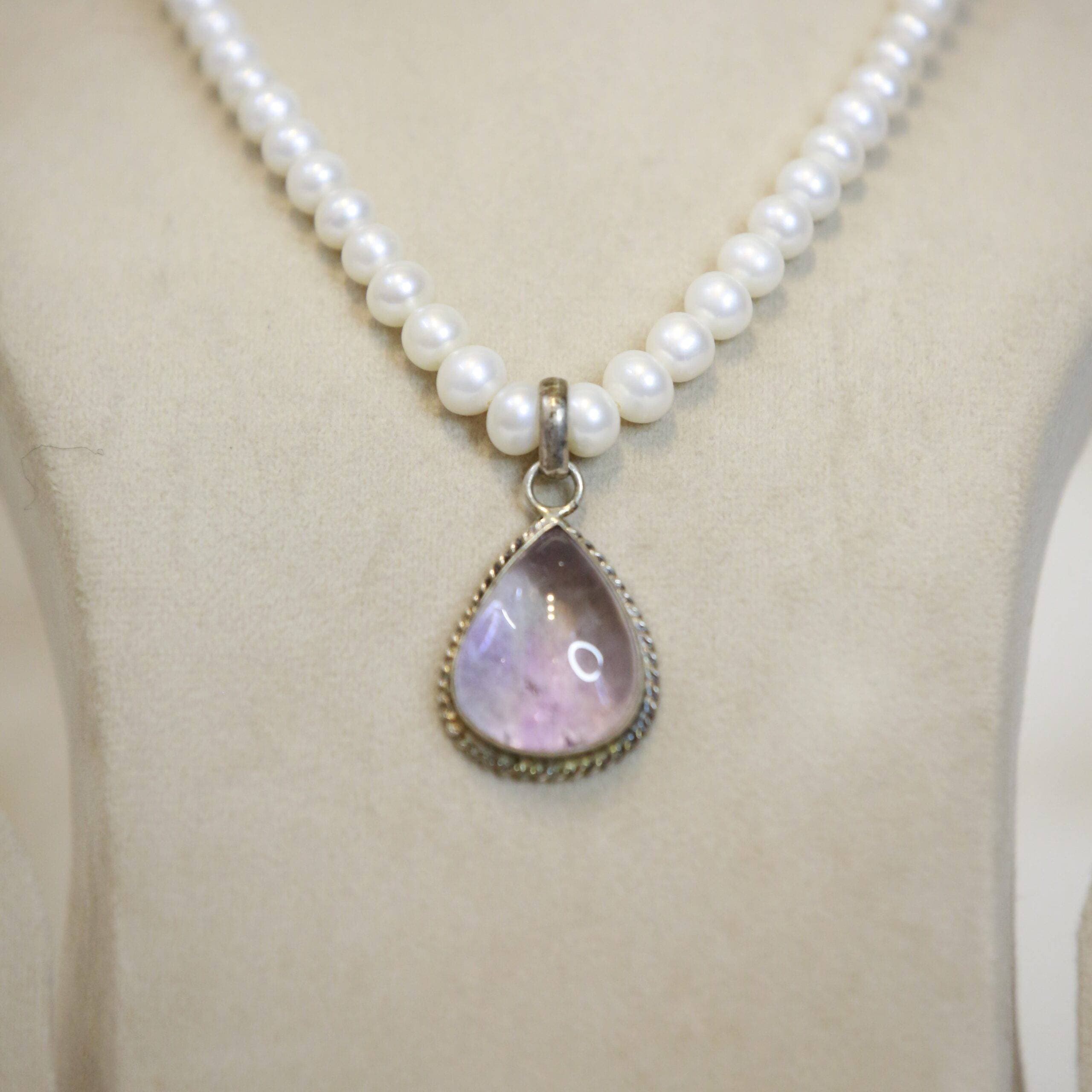 Attractive single-line white round pearl necklace graduated from 4mm to 8mm accentuated by a pure silver pendant studded with light amethyst.