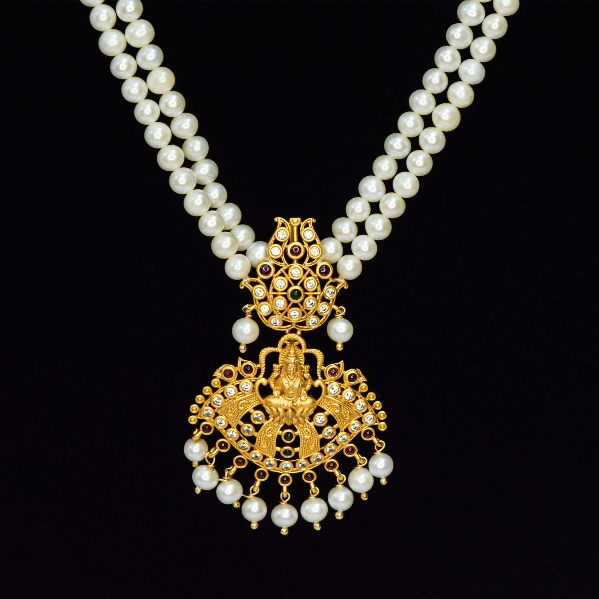 Two-row rich white round pearl long necklace with a traditional matt finish Lakshmi pendant studded with zircons, semi-precious Rubies & Emerald.