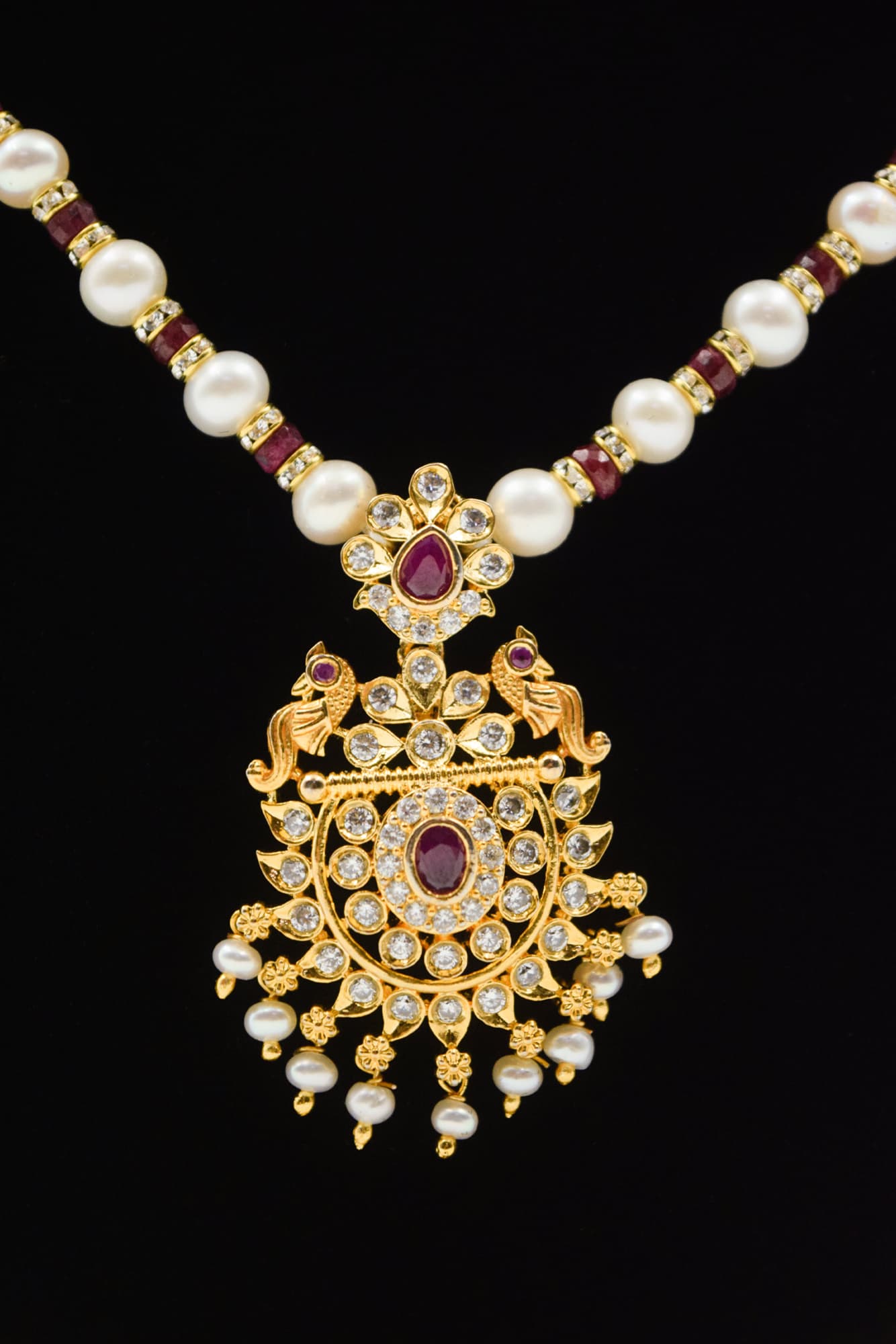 Elegant 5mm white semi-round original pearls strung together with a traditional pendant studded with AD & SP rubies.