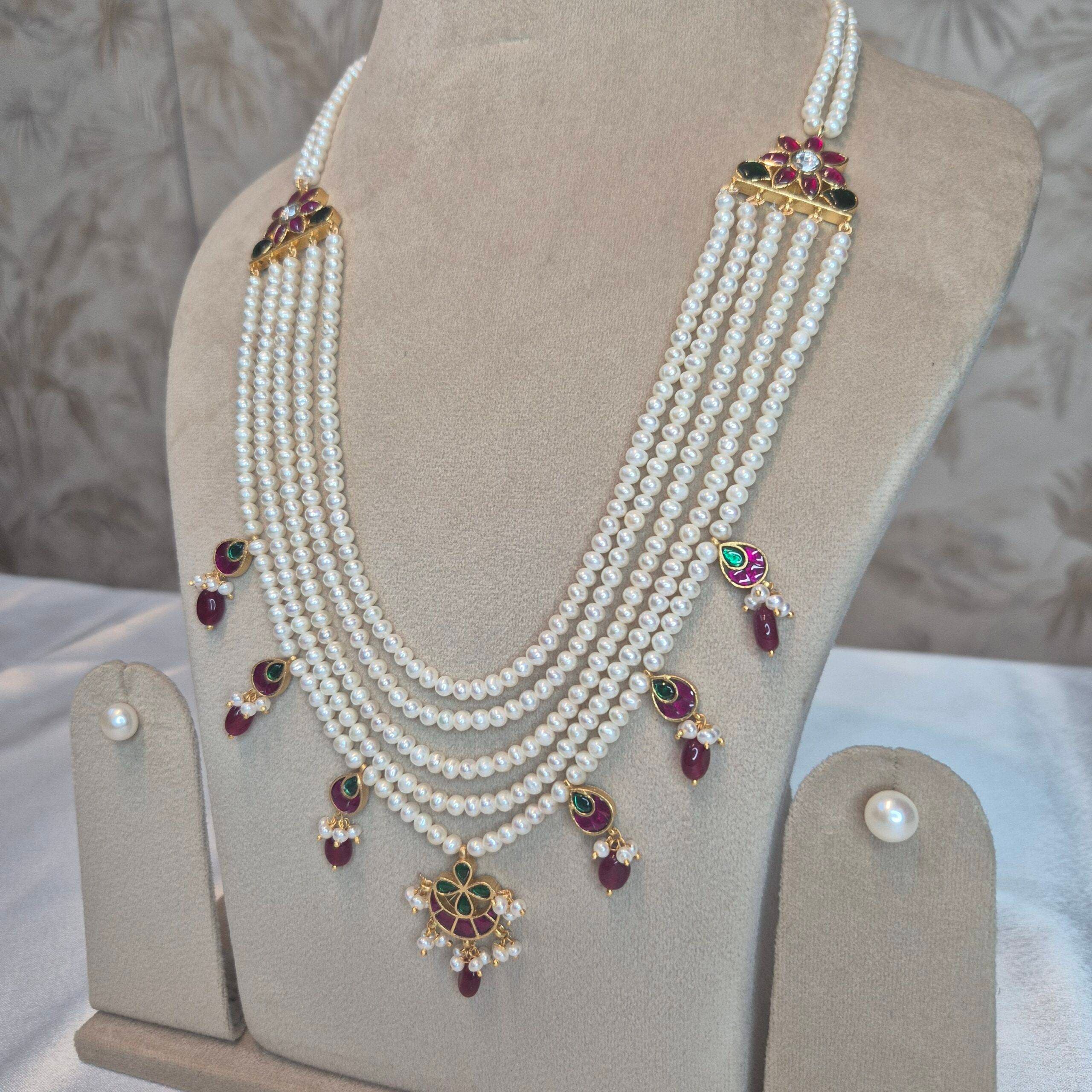 This last row of pearls is enhanced with small kemp pendants that are kept aesthetically.