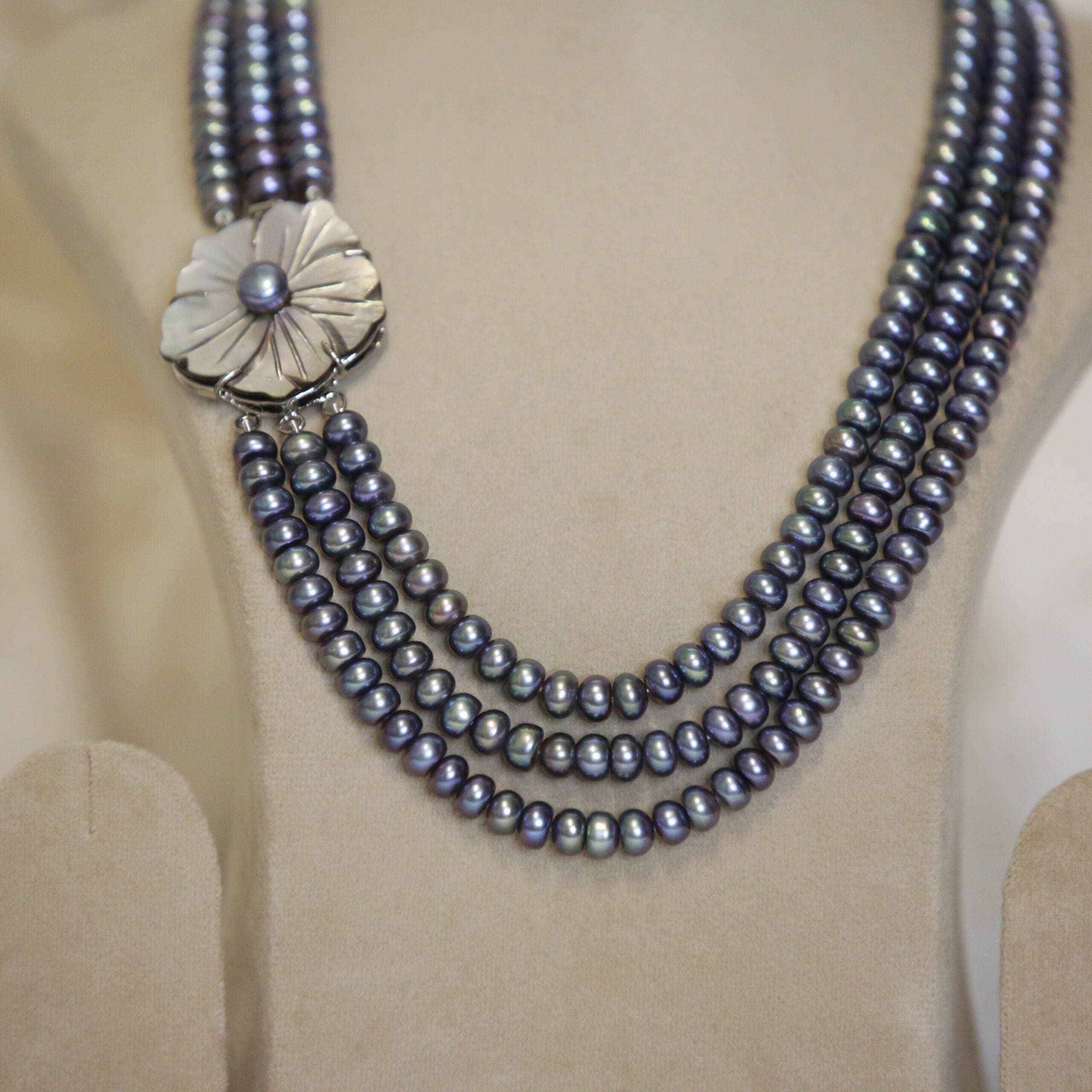 Very luxurious and incredibly elegant 3-line necklace featuring 7mm bluish purple semi-round pearl with a profound floral mother-of-pearl side pendant.