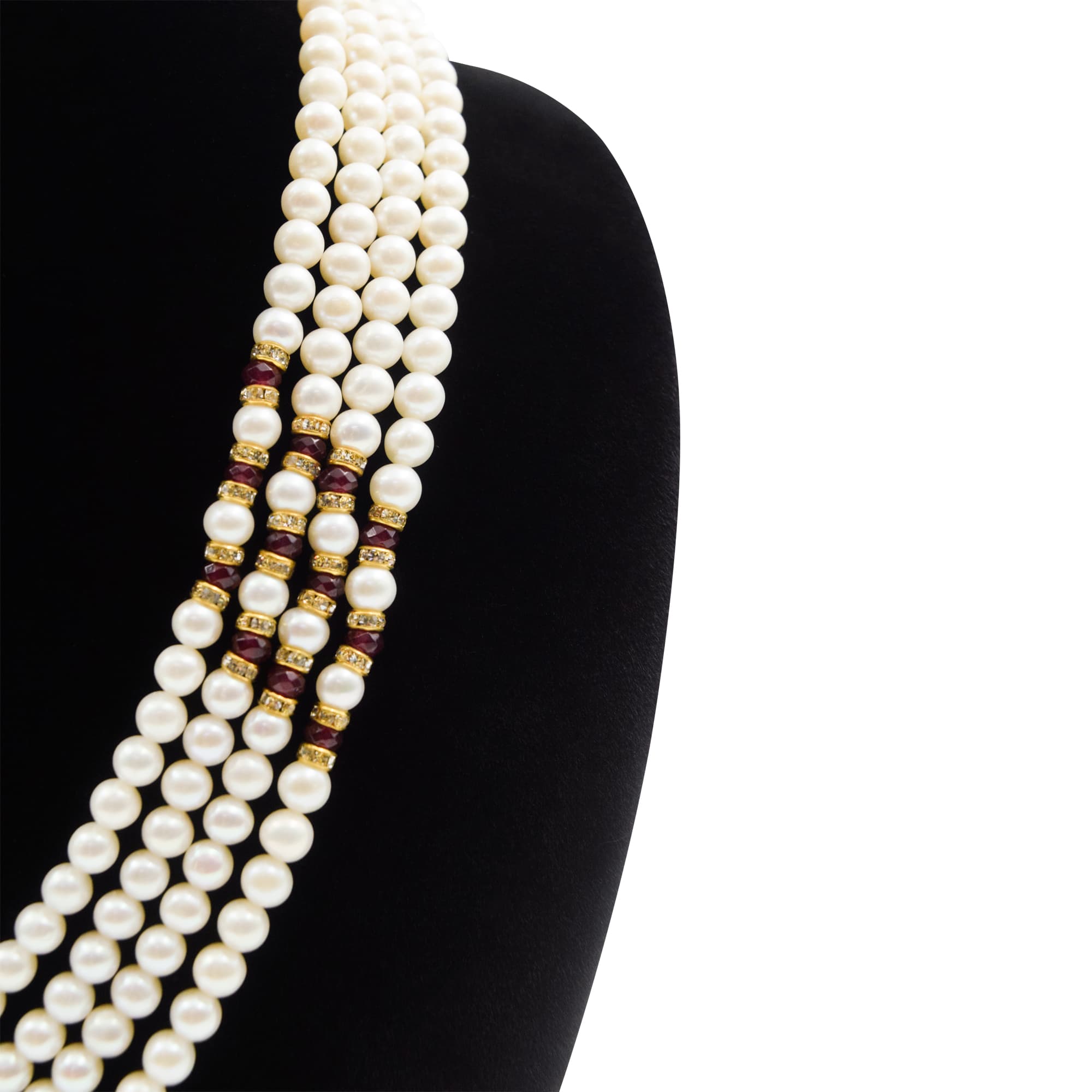 Well-designed side pendant pearl necklace in white pearls featuring a beautiful round pendant with semi-precious rubies.
