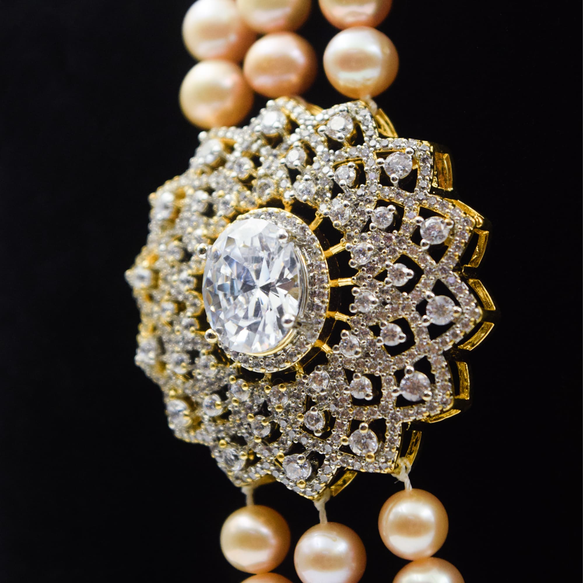 The triple-layer haar features peach pearls strung elegantly with sparkling side brooches.