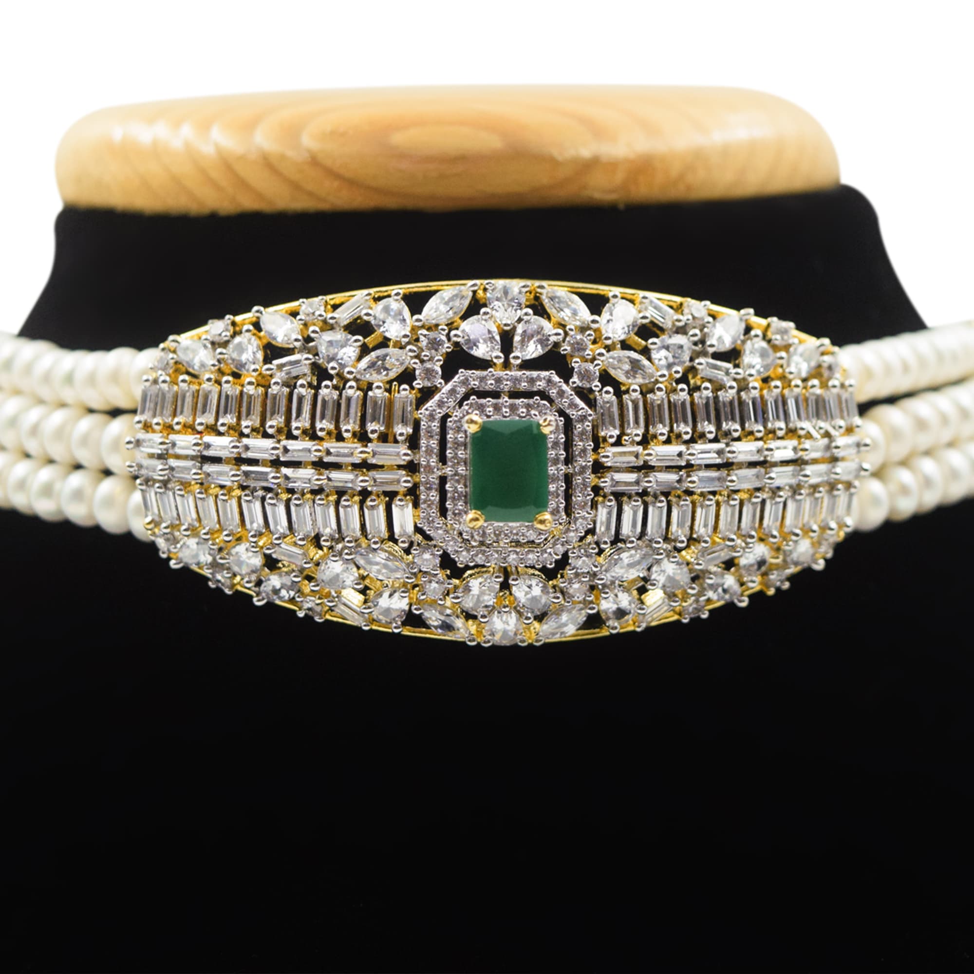 This beautiful choker is well crafted with semi-round pearls with zircon studded line spacers with Green cz crystal.