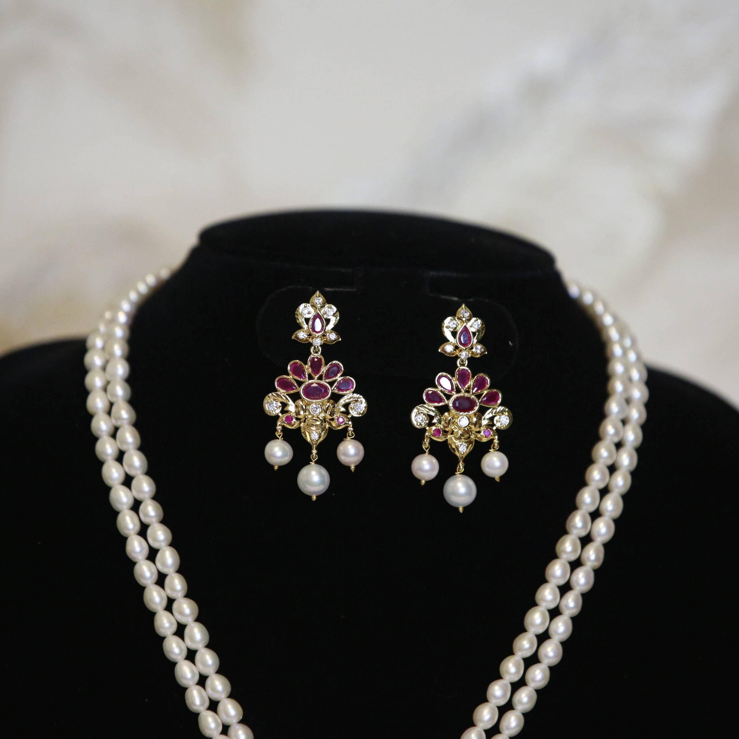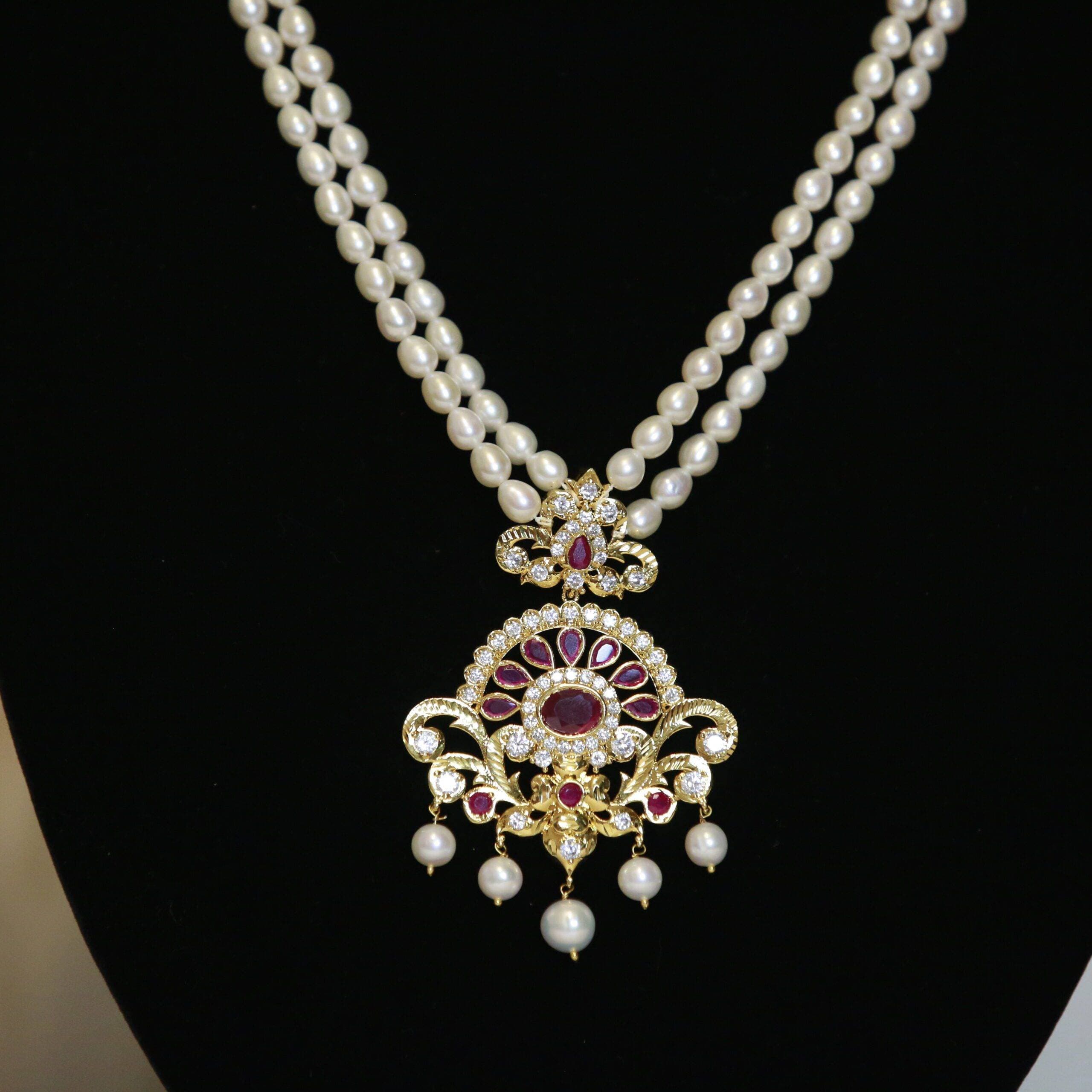 A limited edition of traditional pieces featuring a dual-line long necklace made of 5.5mm white oval pearls attached to an ornately designed traditional CZ & SP Ruby pendant.