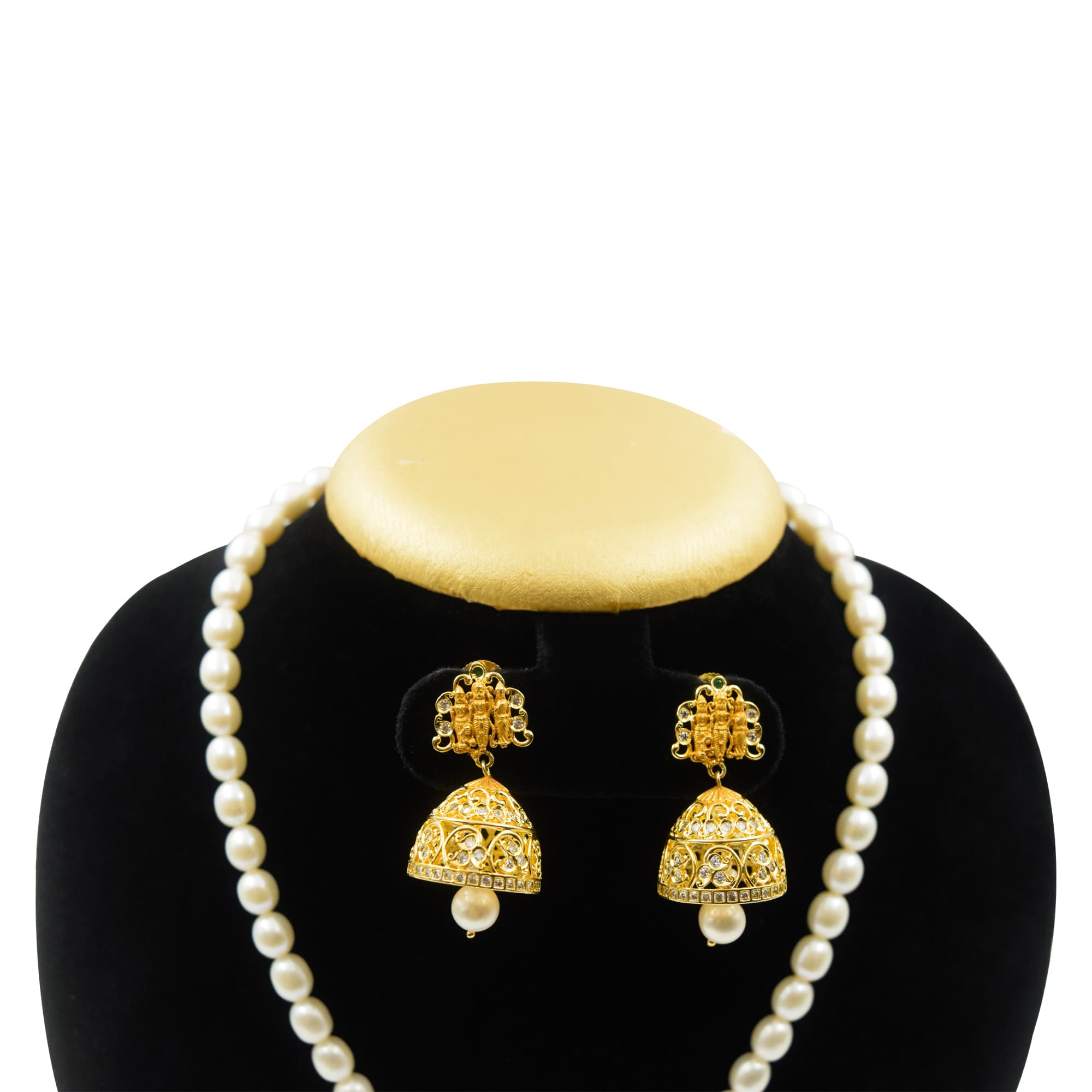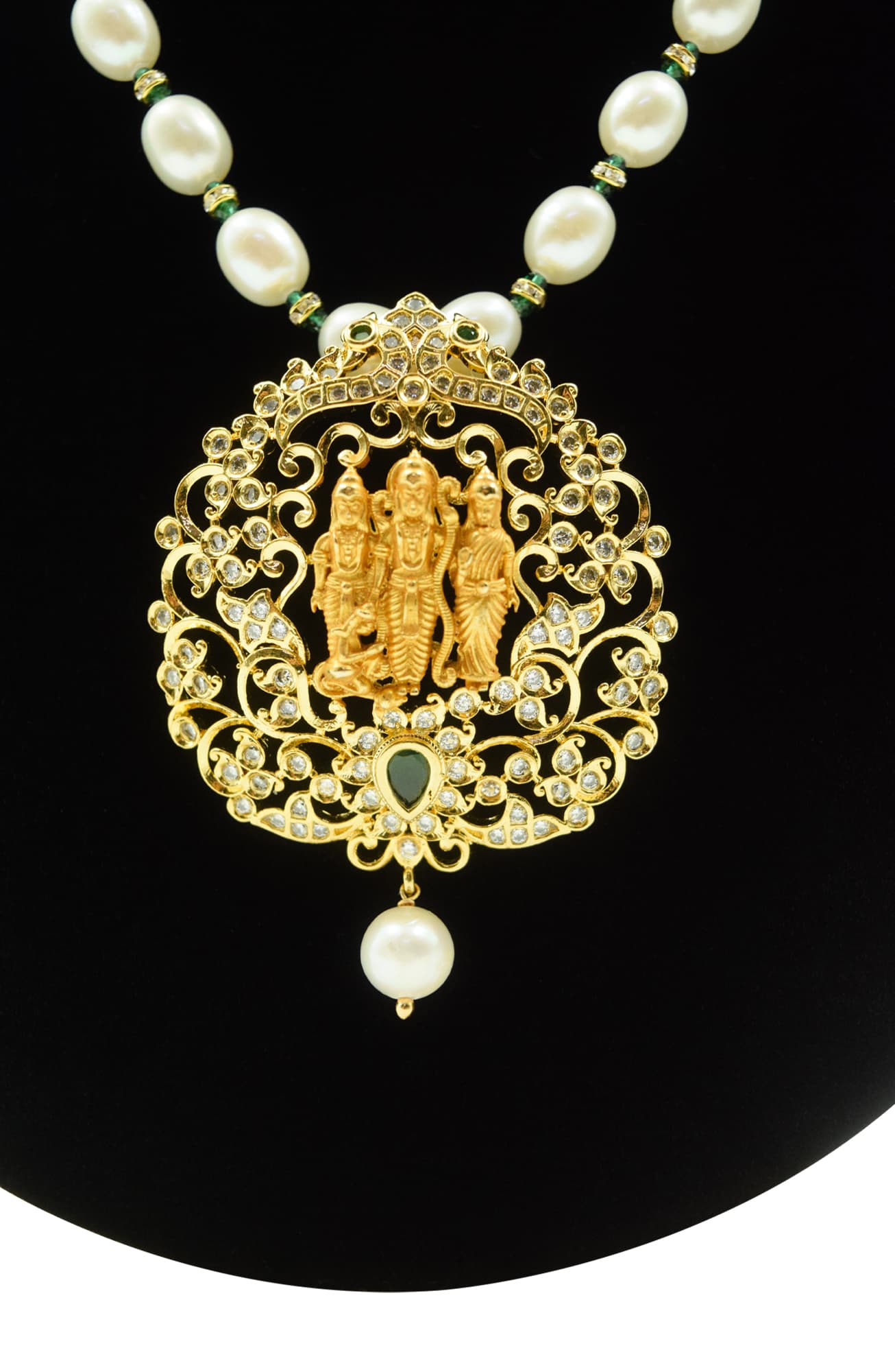 Rich 7mm oval white pearls long necklace with an ethereal and divine zircon studded Ram Darbar pendant featuring Lord Rama, Laxmana, Seetha & Hanuman.