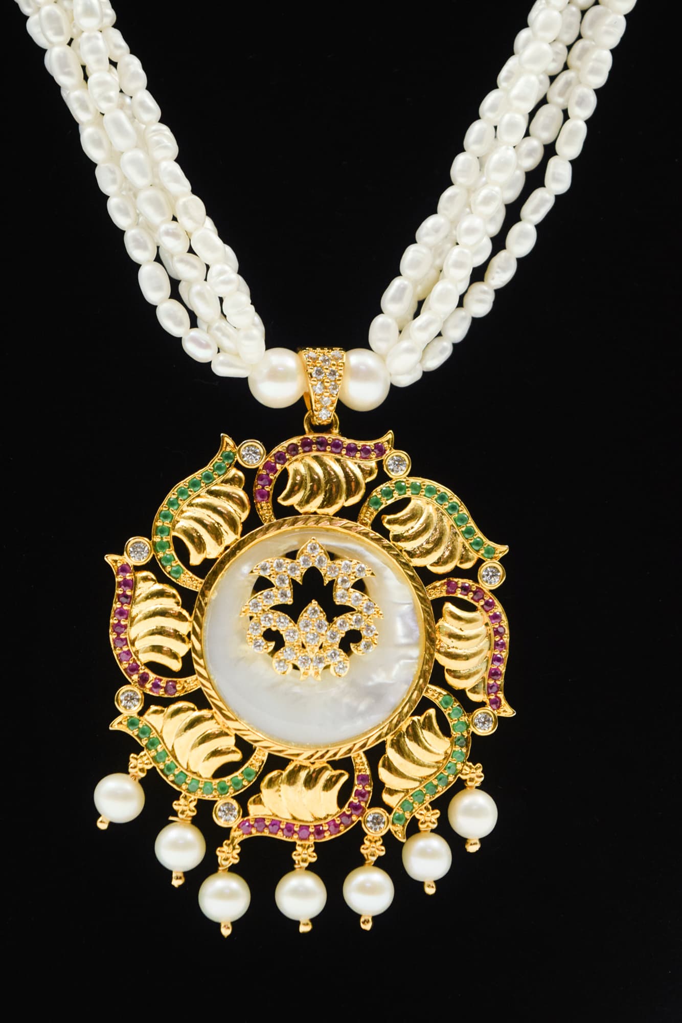 A limited edition artistic statement necklace made with five strands of white 3mm rice pearls attached to a golden finish mother-of-pearl designer pendant.