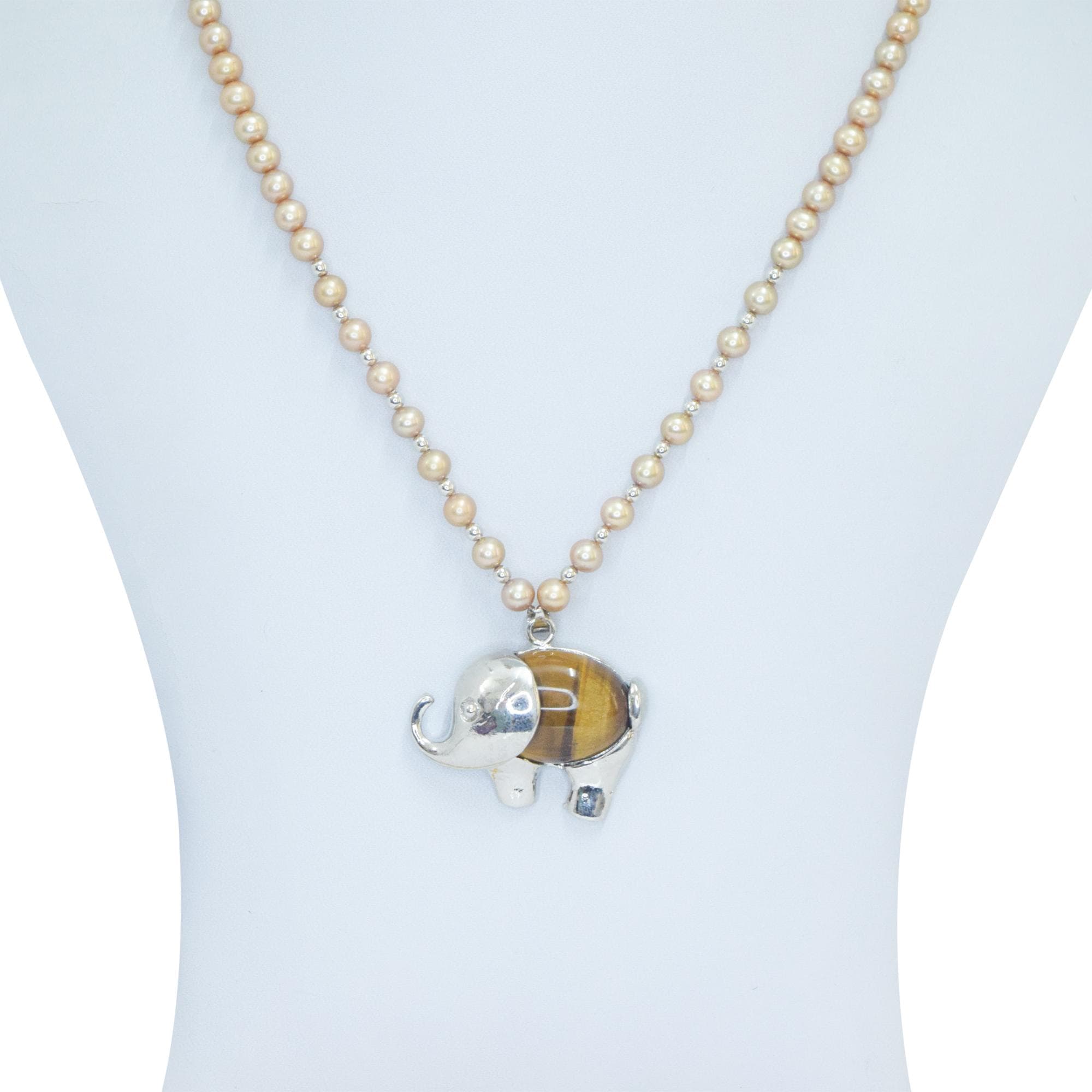 Golden Pearl Necklace With Tiger Eye Elephant Pendant