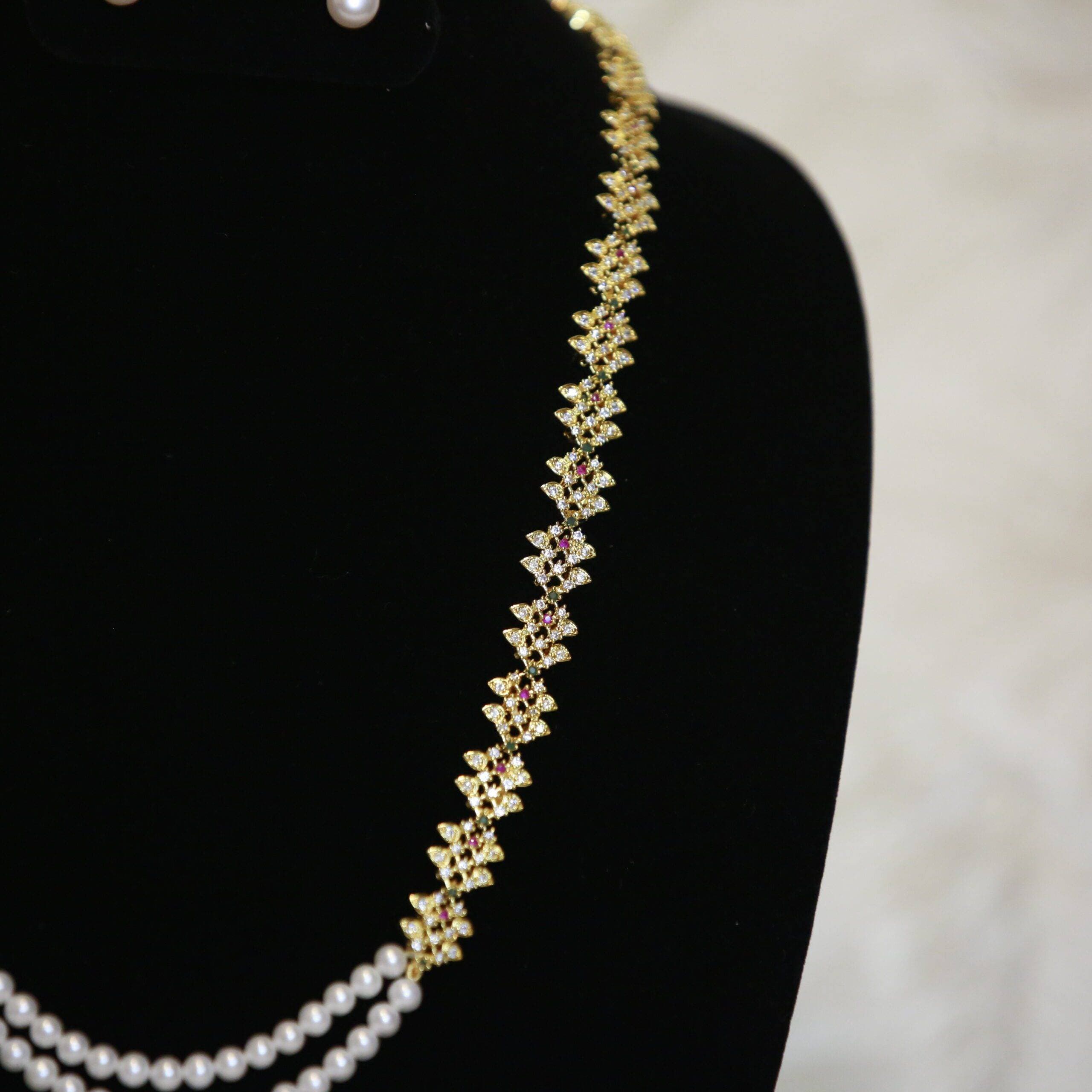 On one side there is a CZ studded leafy decorative necklace which is perfectly attached to the pearls.