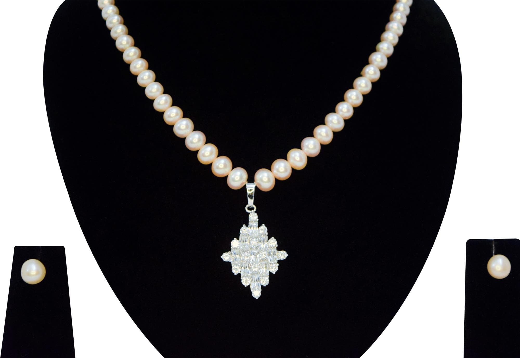 The necklace is paired with pretty pink pearl studs as shown in the picture.