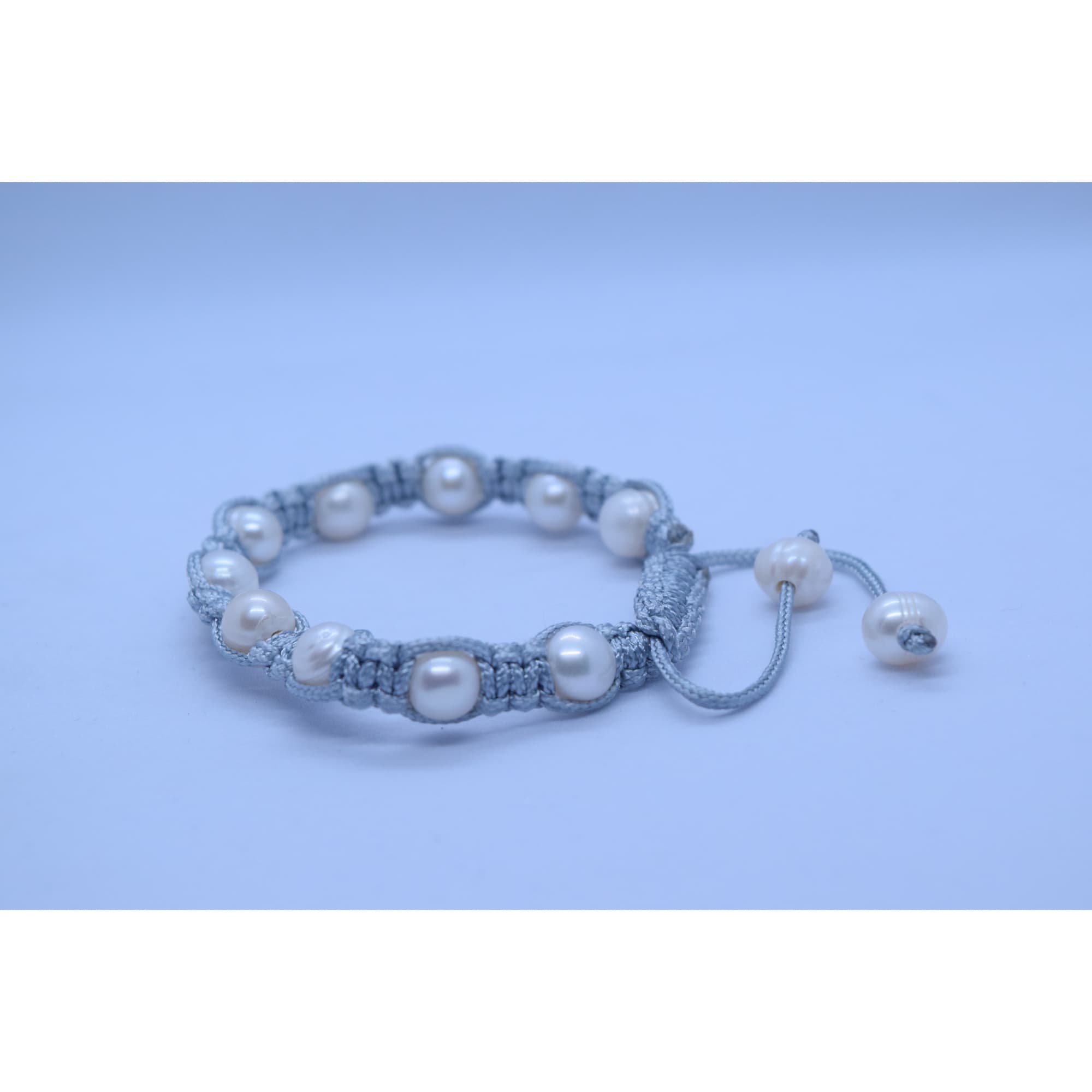 Handcrafted single-layer boho-inspired light grey shaded macrame adjustable bracelet featuring 9mm white potato-shaped freshwater pearls.