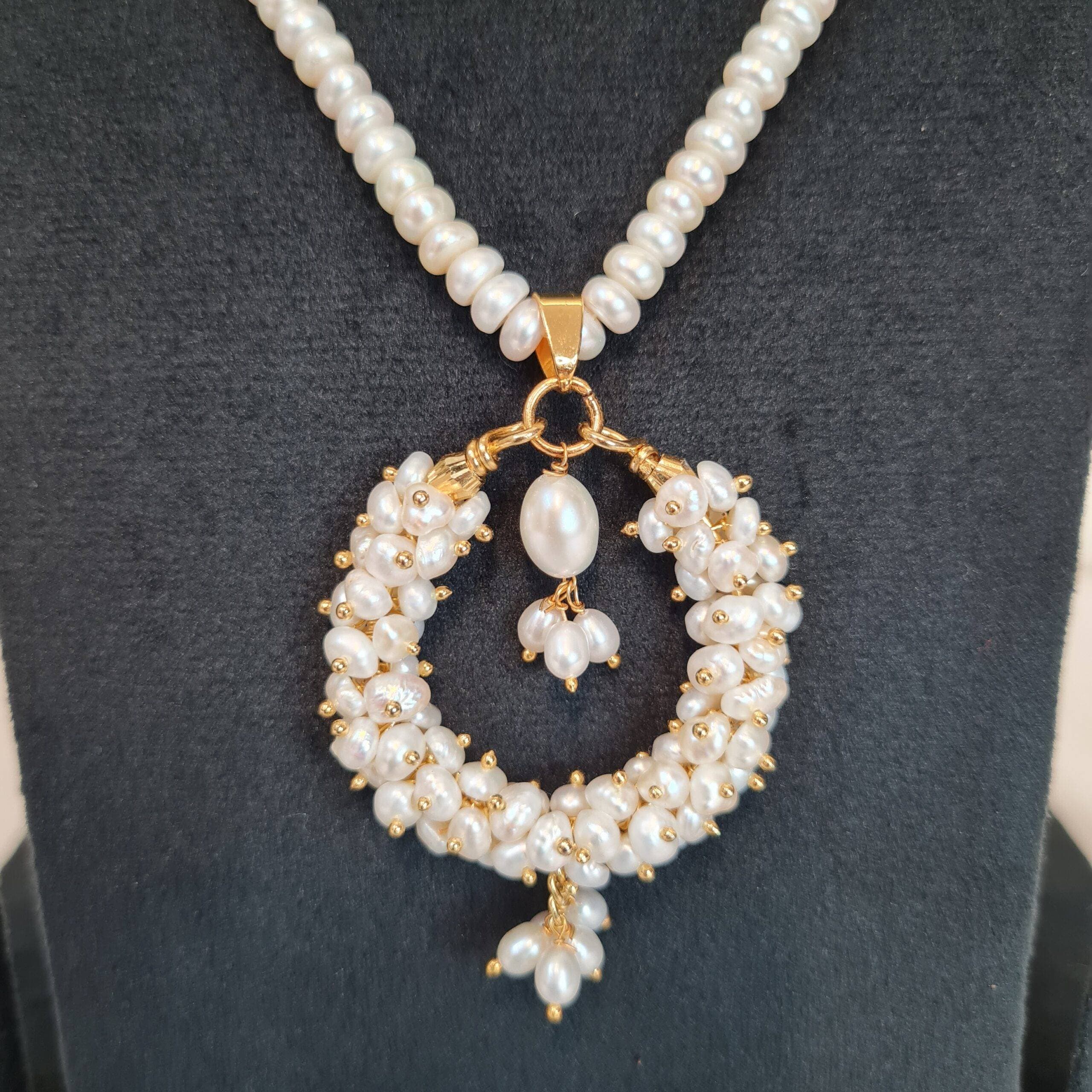 A well-crafted 19-inch long necklace featuring 5 mm white semi-round pearls with large seed pearls Chand Bali pendant.