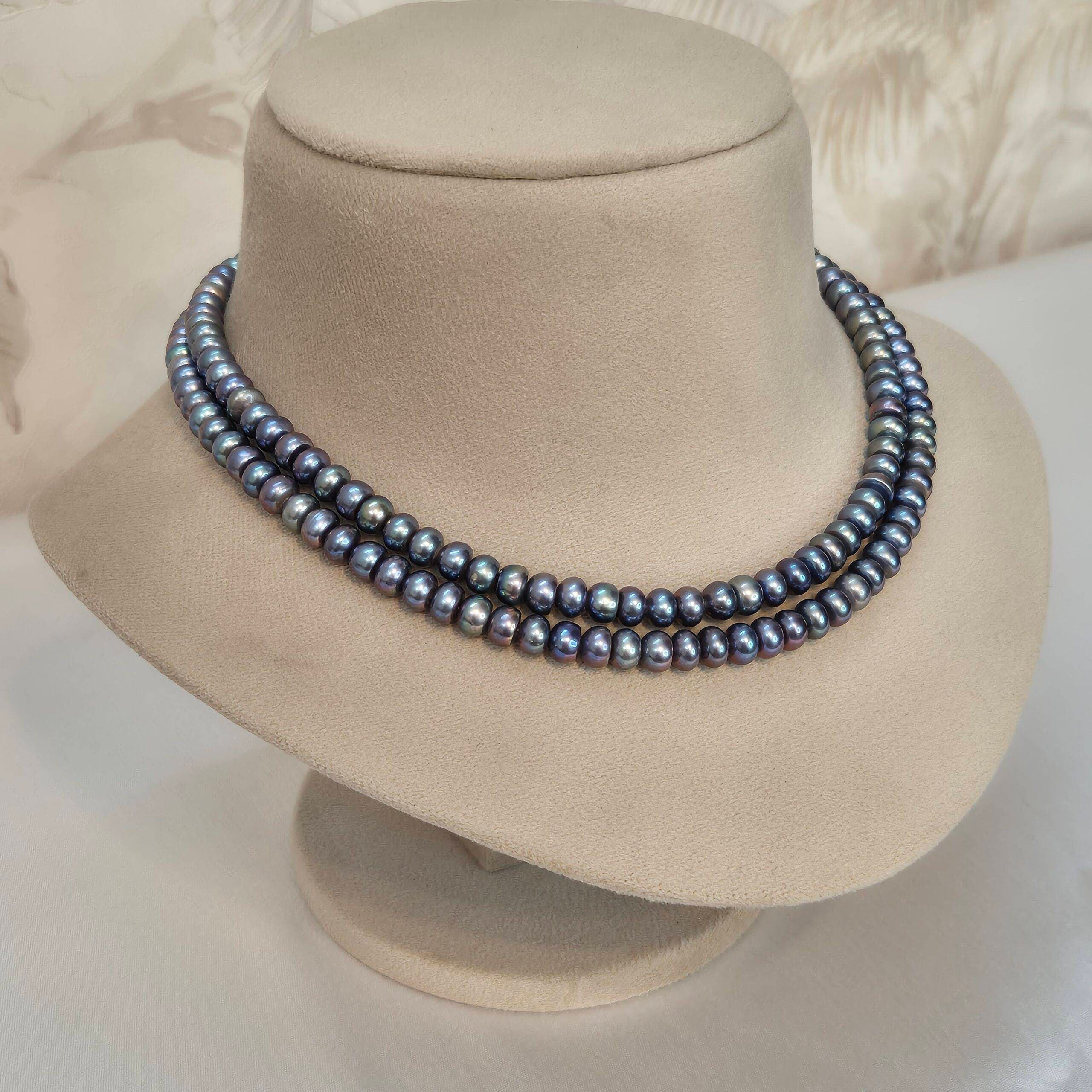 Crafted from lustrous 7mm pearls, each pearl showcases a mesmerizing blueish-green hue, adding a modern twist to a classic design.