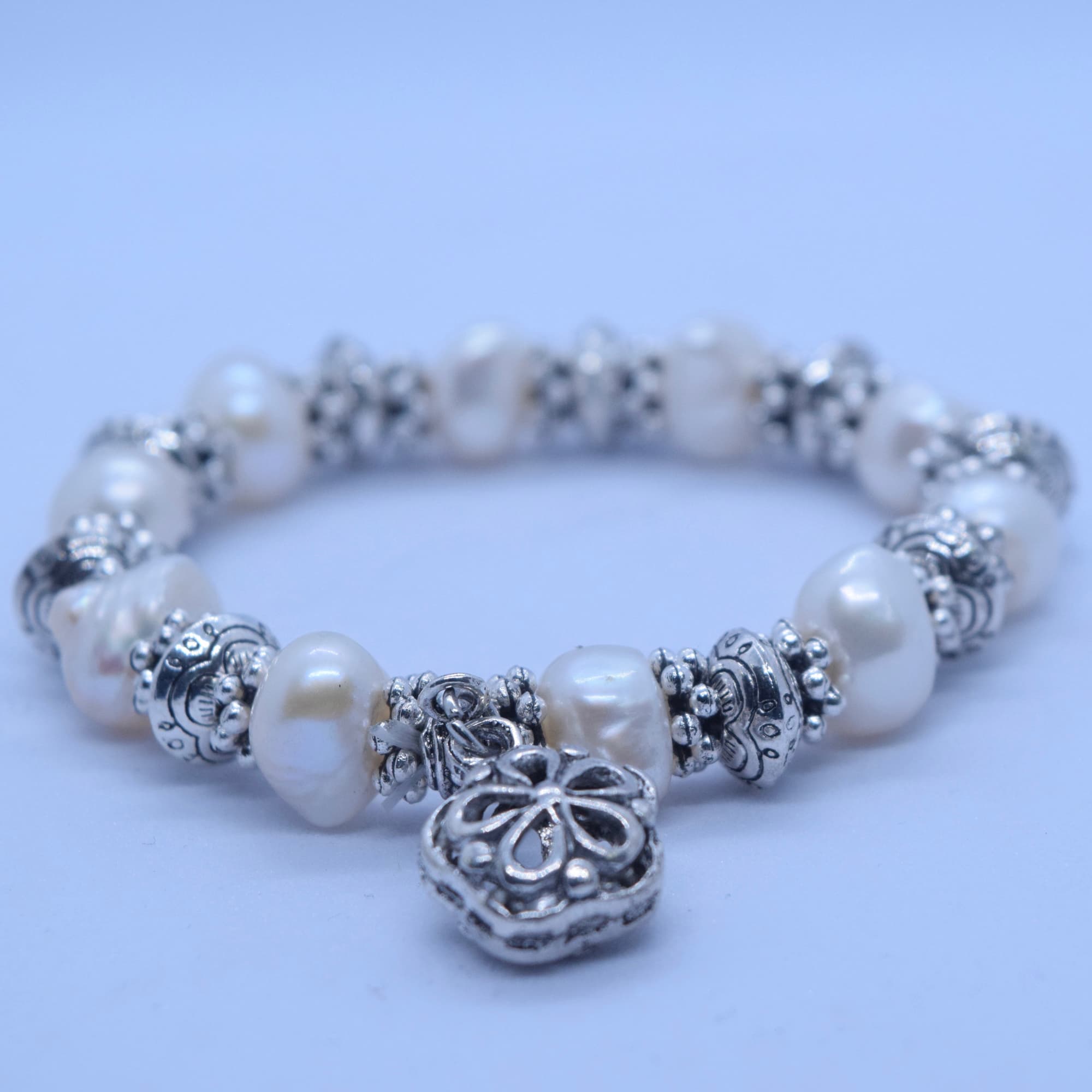 A Vintage Bohemian-inspired white baroque pearl expandable bracelet with cute white metal spacers & a floral charm pendant.