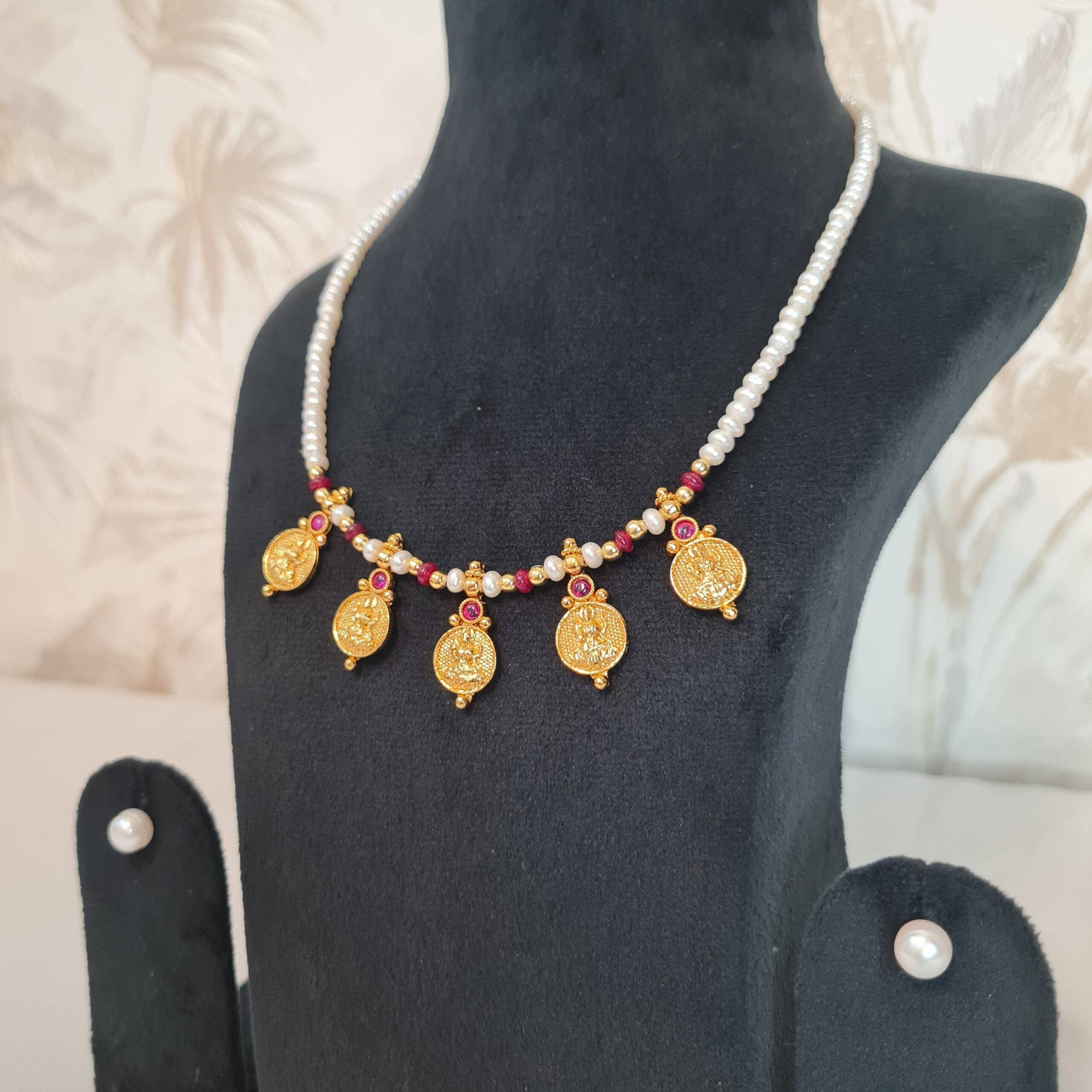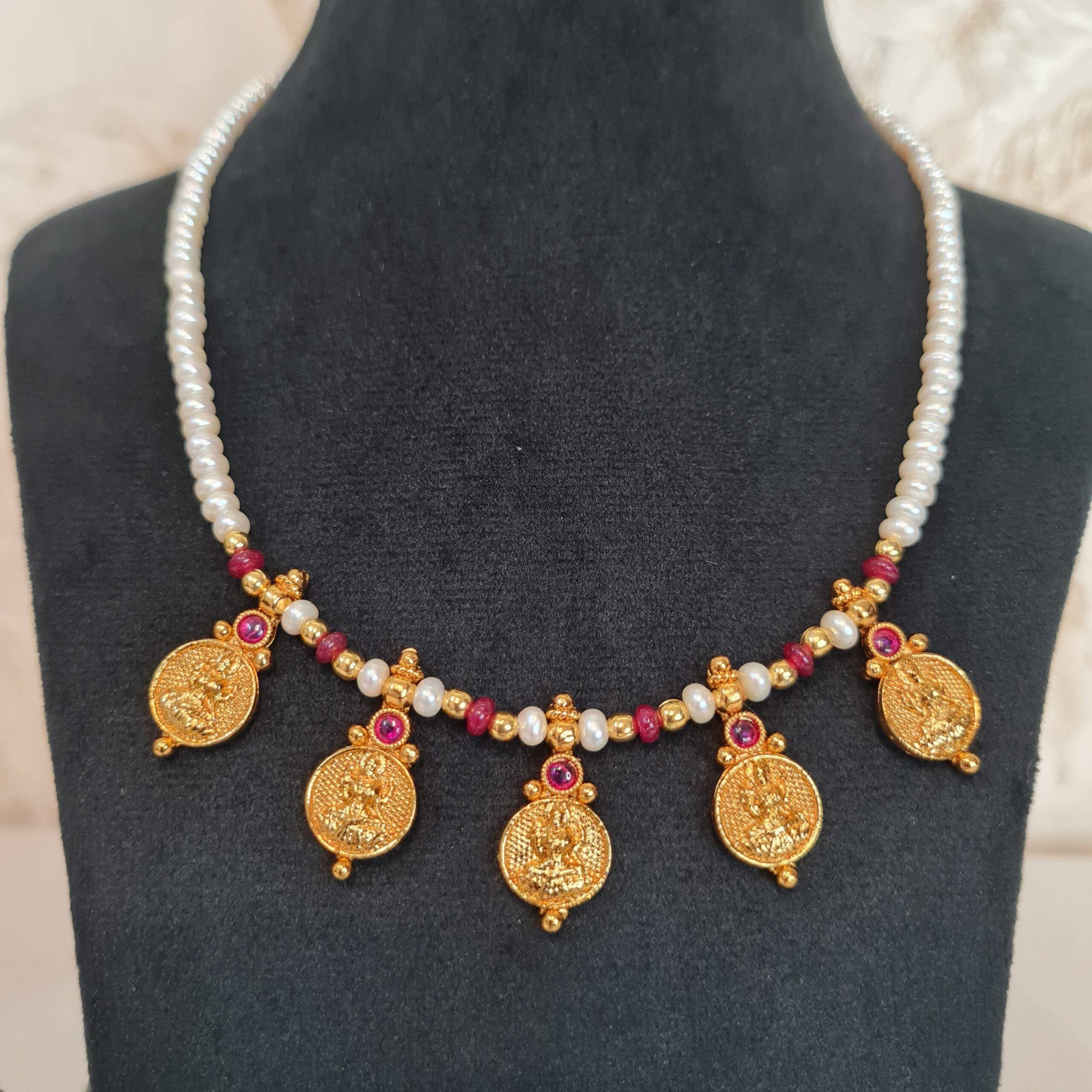 A traditional simple necklace featuring 4mm semi-round white pearls accentuated by golden Goddess Lakshmi Kaasu's with SP ruby beads & golden finish balls.
