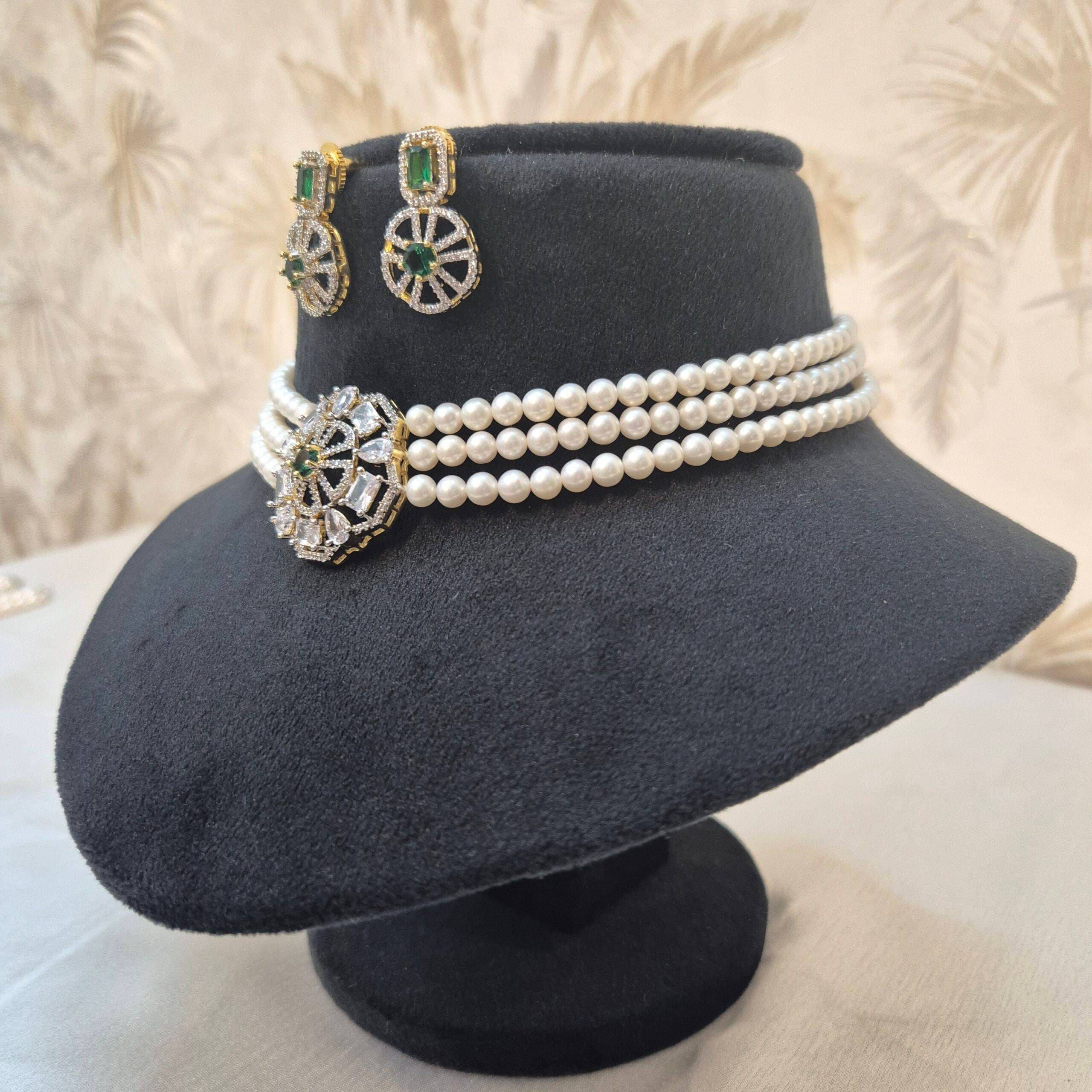 A well-crafted 3-line choker with shiny 5mm white round pearls accentuated by a CZ & SP emerald studded abstract pendant.