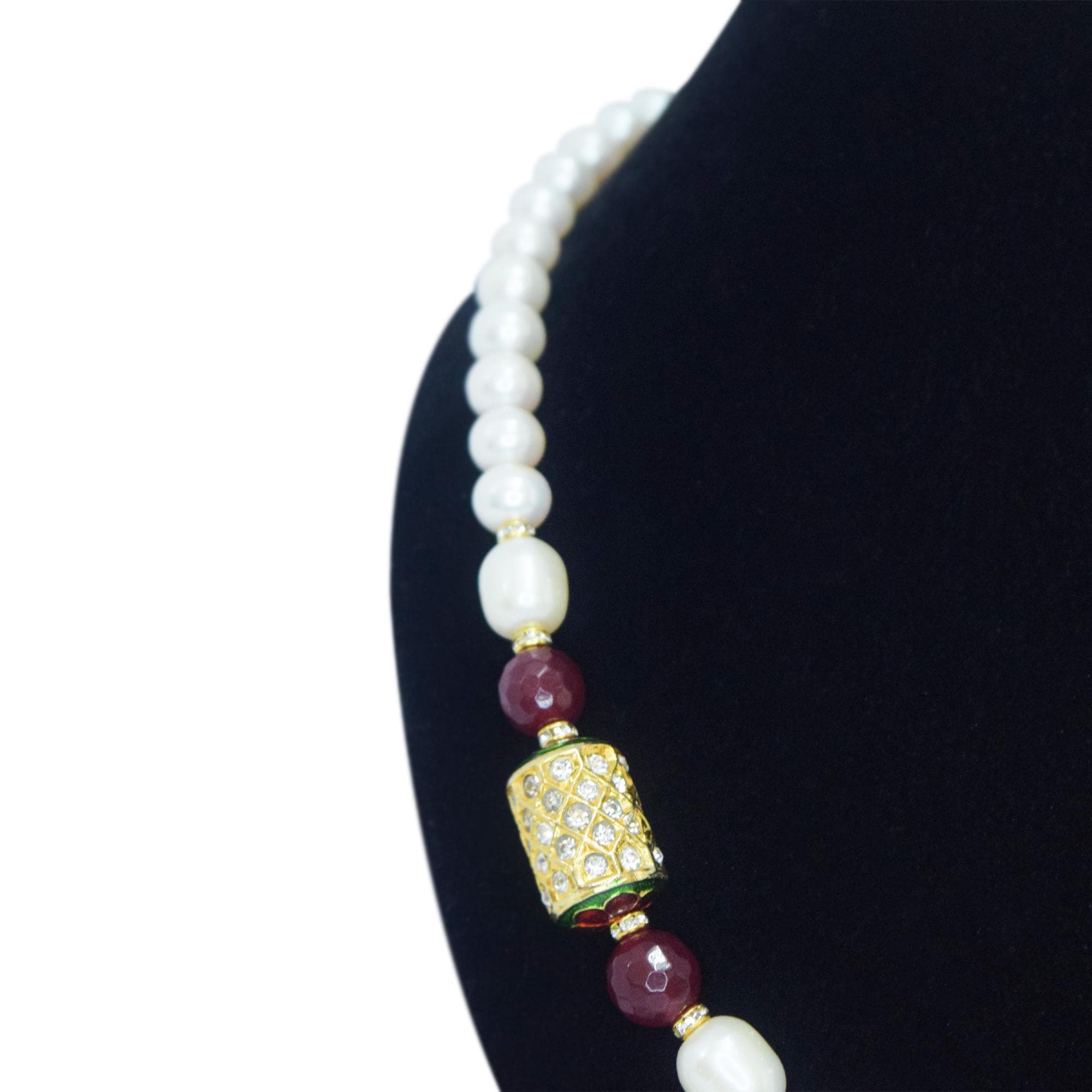 Well-crafted sparkling white pearls along with a side single jadau inspired meenakari dholak bead make this piece unique and beautiful.
