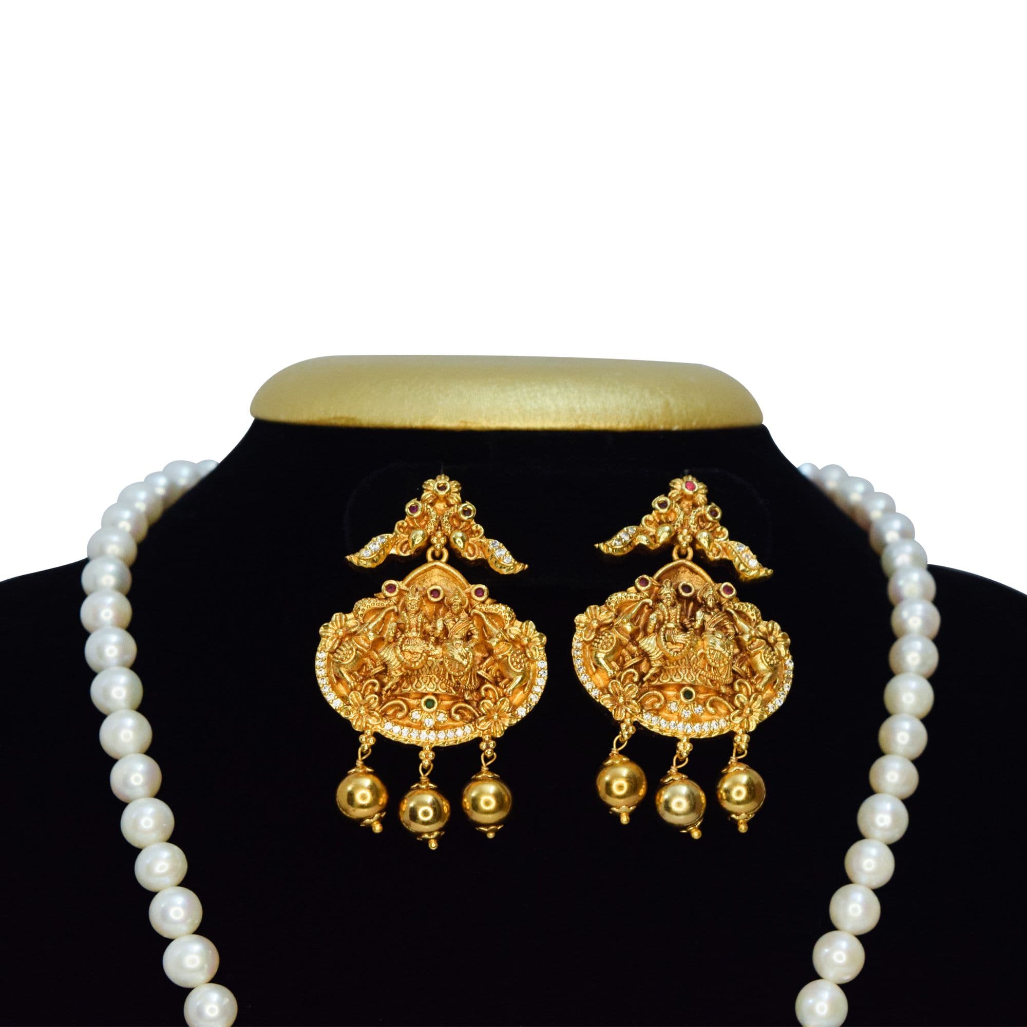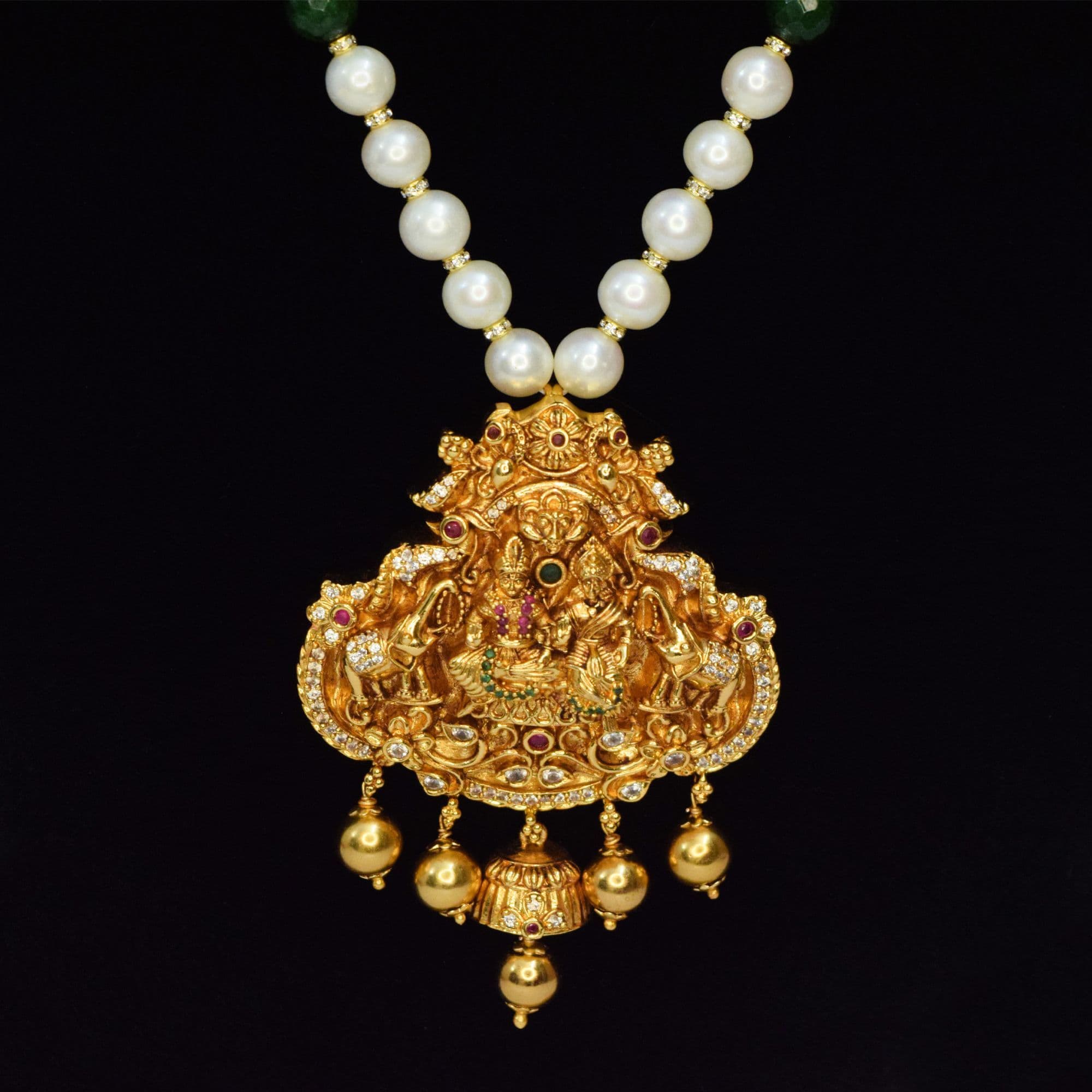 This traditional Pendant has Lord Krishna seated along with Radha with majestic zircon studded elephants on either side.