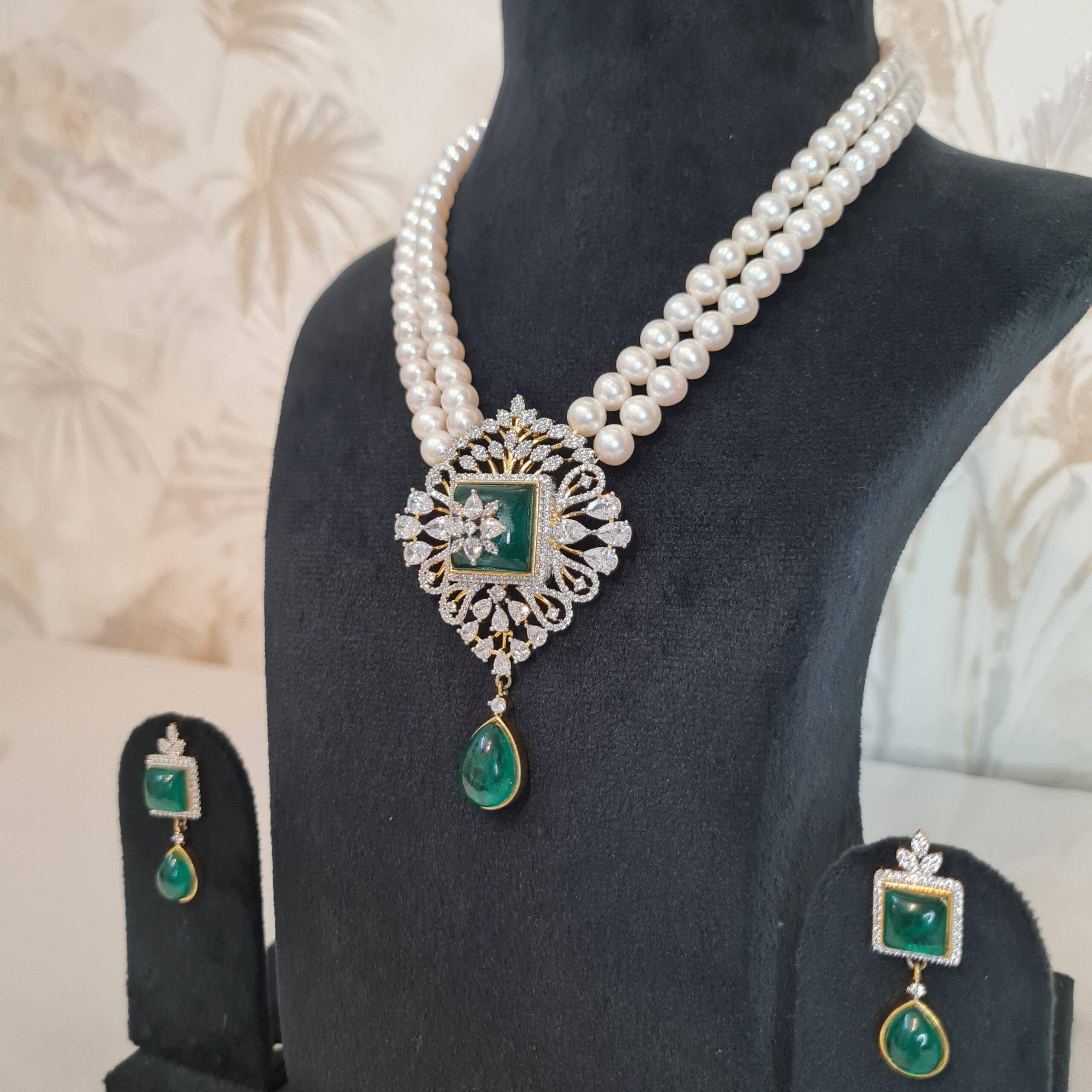 A designer necklace made with two strands of white 6.5mm round pearls attached to a stately Zircon & SP emerald pendant.