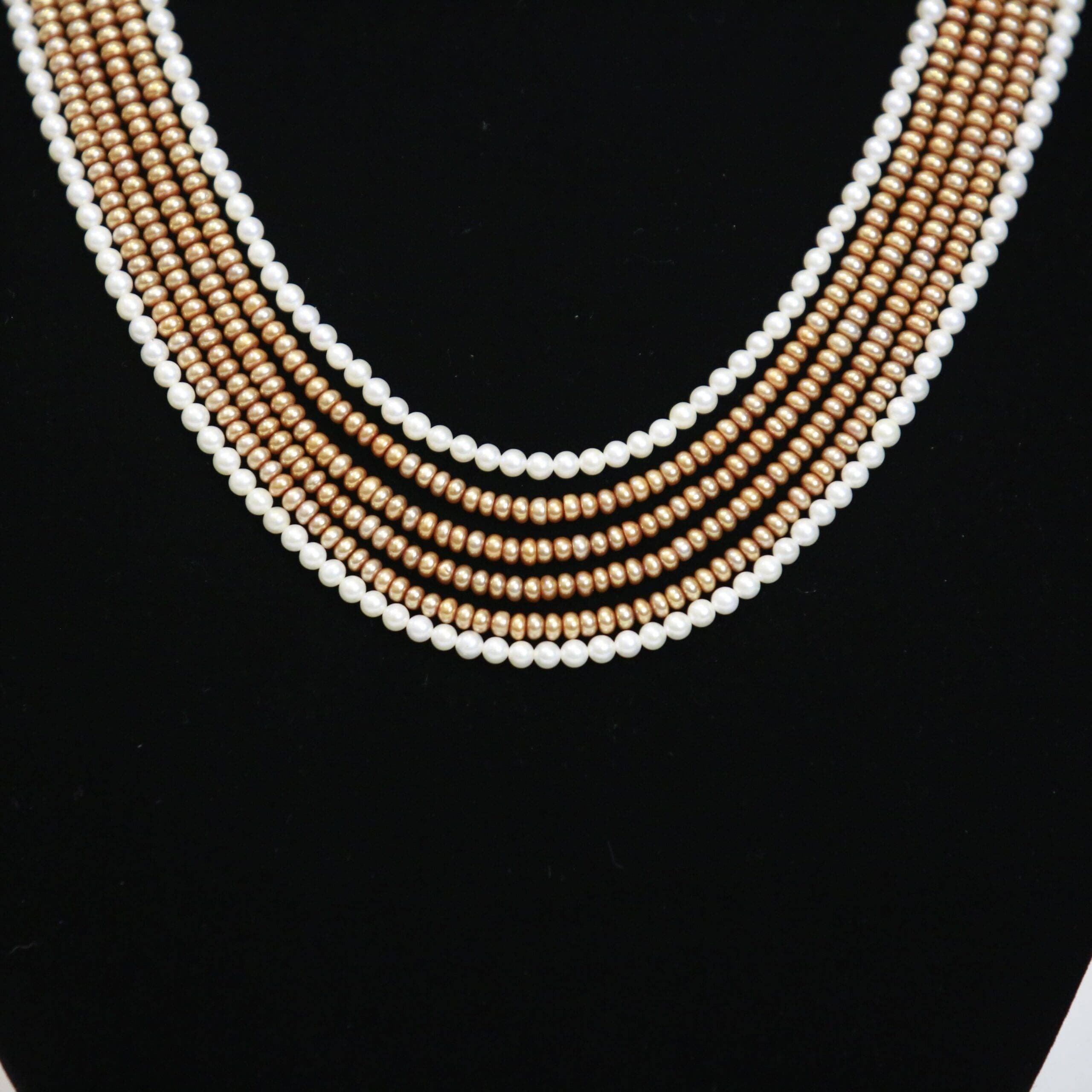 Exceptional designed & finely crafted multi-layer pearls necklace with 4mm white round pearls & 3.5mm half-round copper pearls.