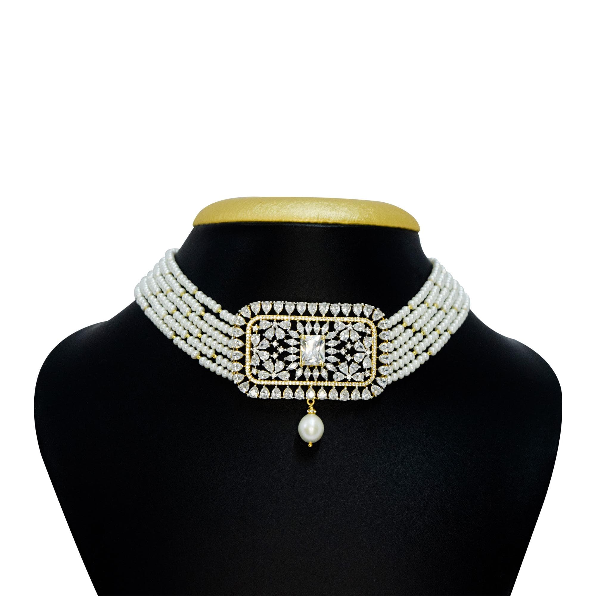 Splendidly designed six-row white semi-round pearl choker with a grand and resplendent zircon pendant.