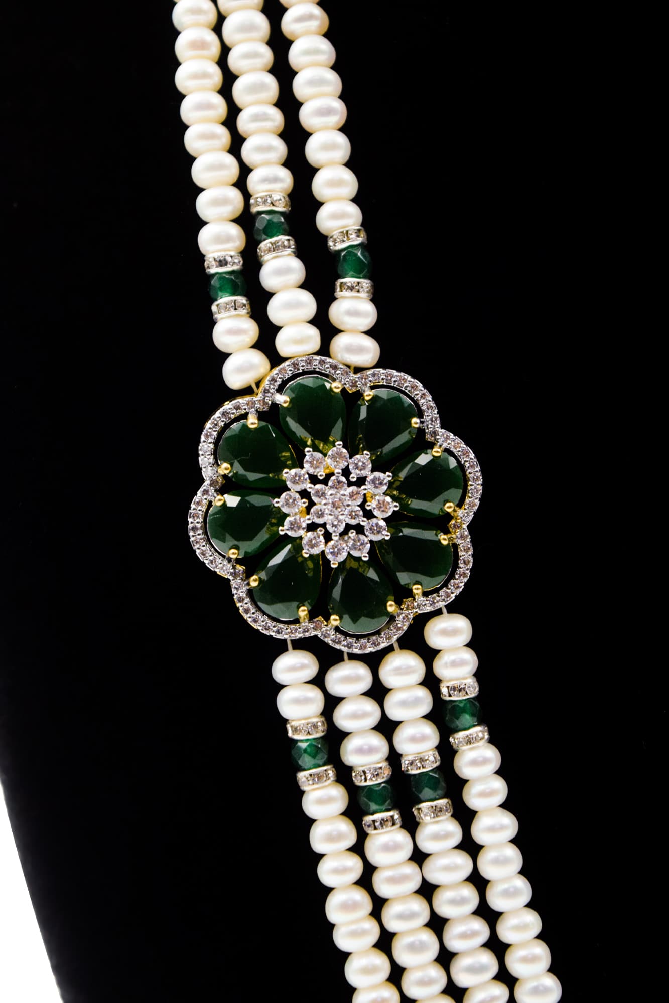 Well-designed white pearl multi-layer haar featuring SP emeralds & zircon floral side pendants.