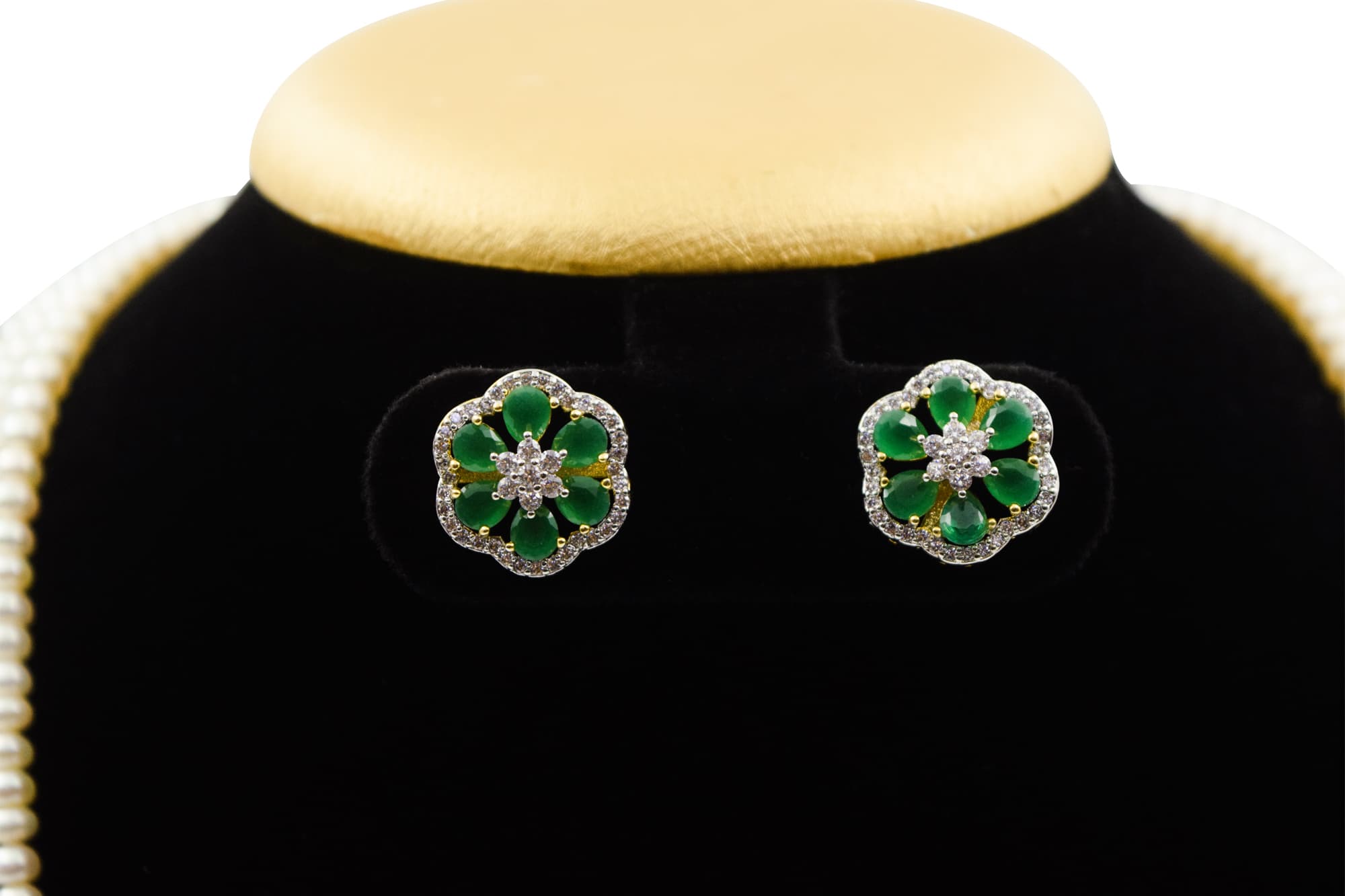 The pendant has large semi-precious emeralds shaped like petals around a cluster of zircons.