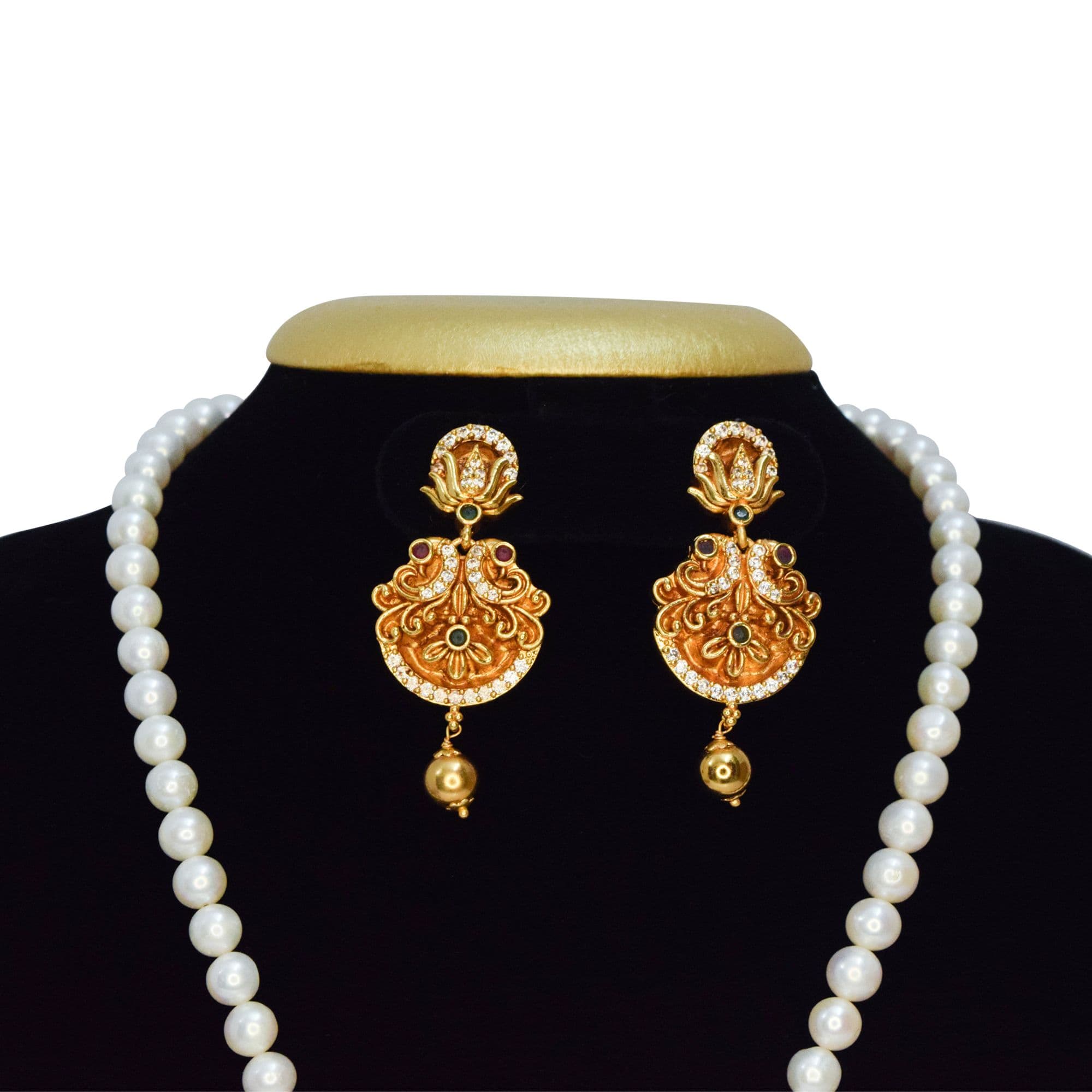The necklace in the lower half features small golden finish ball spacers in between the pearls.
