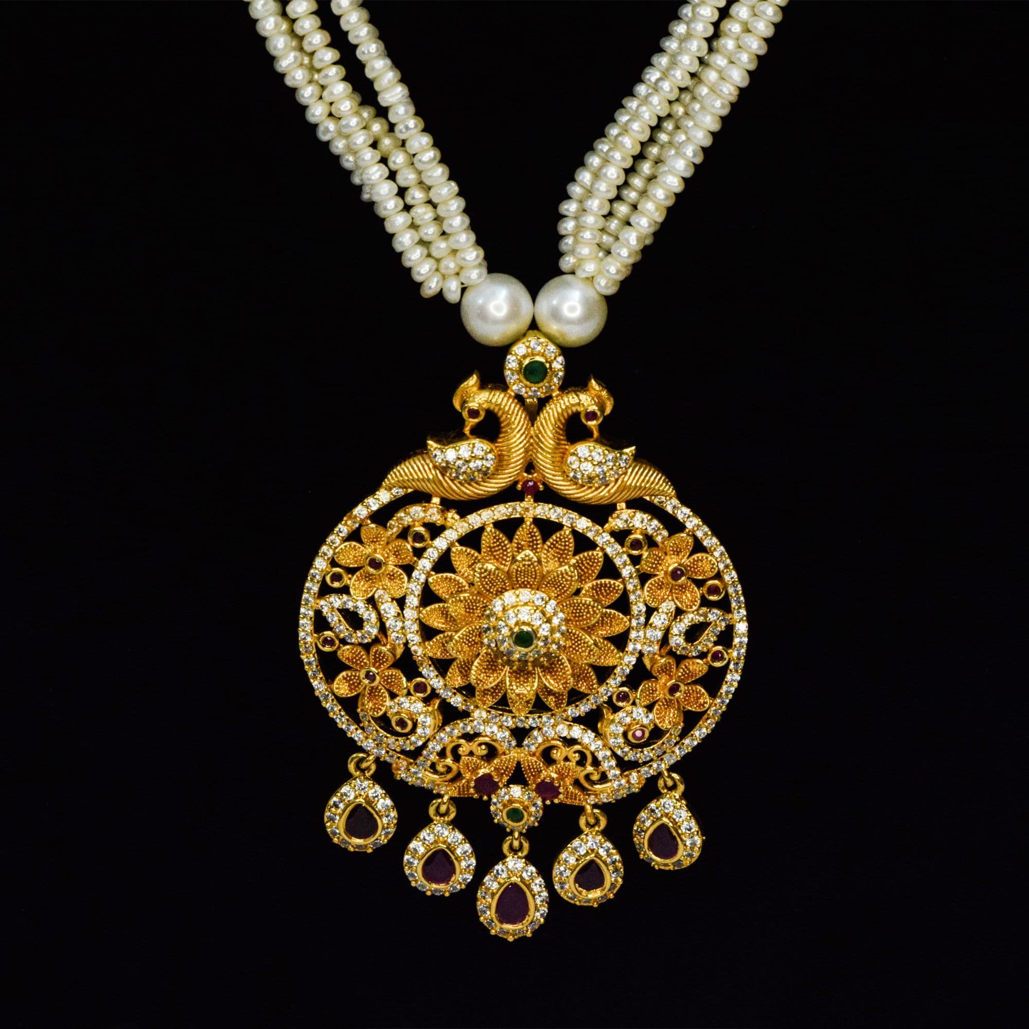 The pendant features matt finish golden flowers, shiny zircons, sp rubies & sp emeralds studded in it.