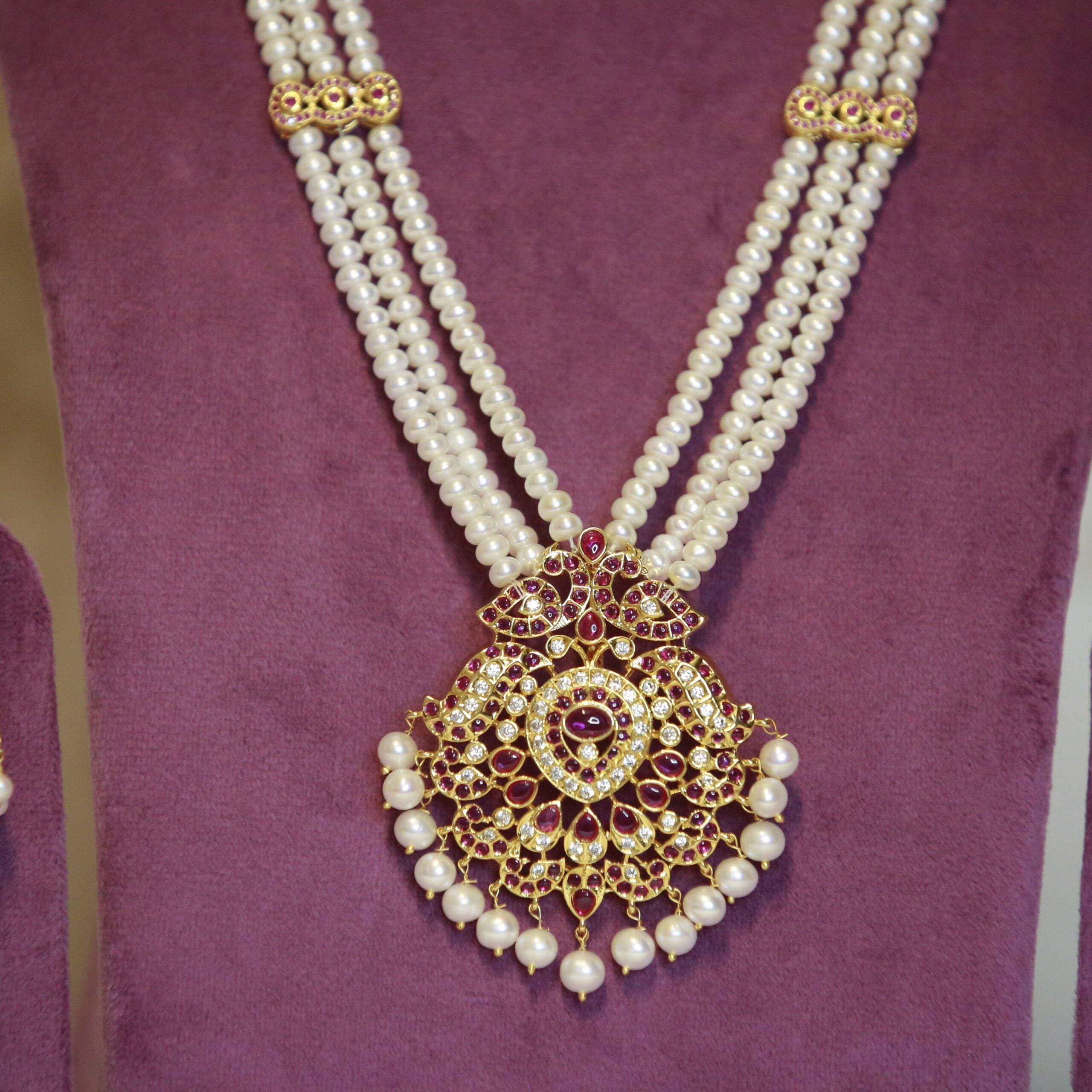 Splendidly crafted triple line haar with 5mm white semi-round pearls accentuated by a grand peacock ruby kemp & CZ pendant.