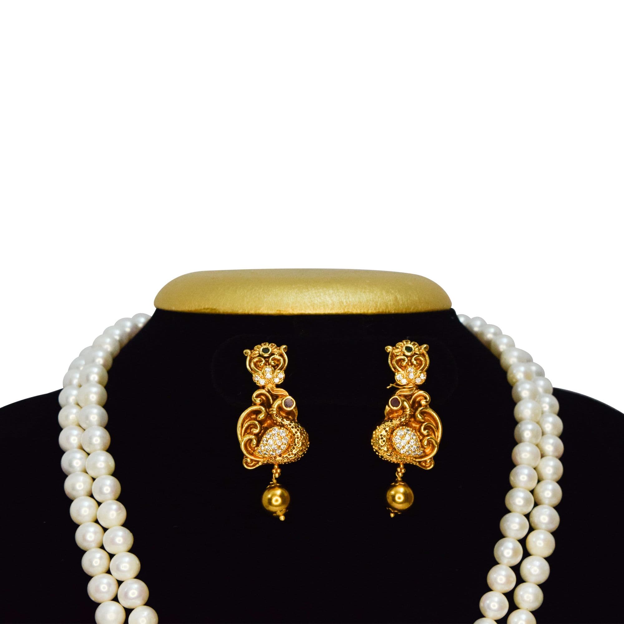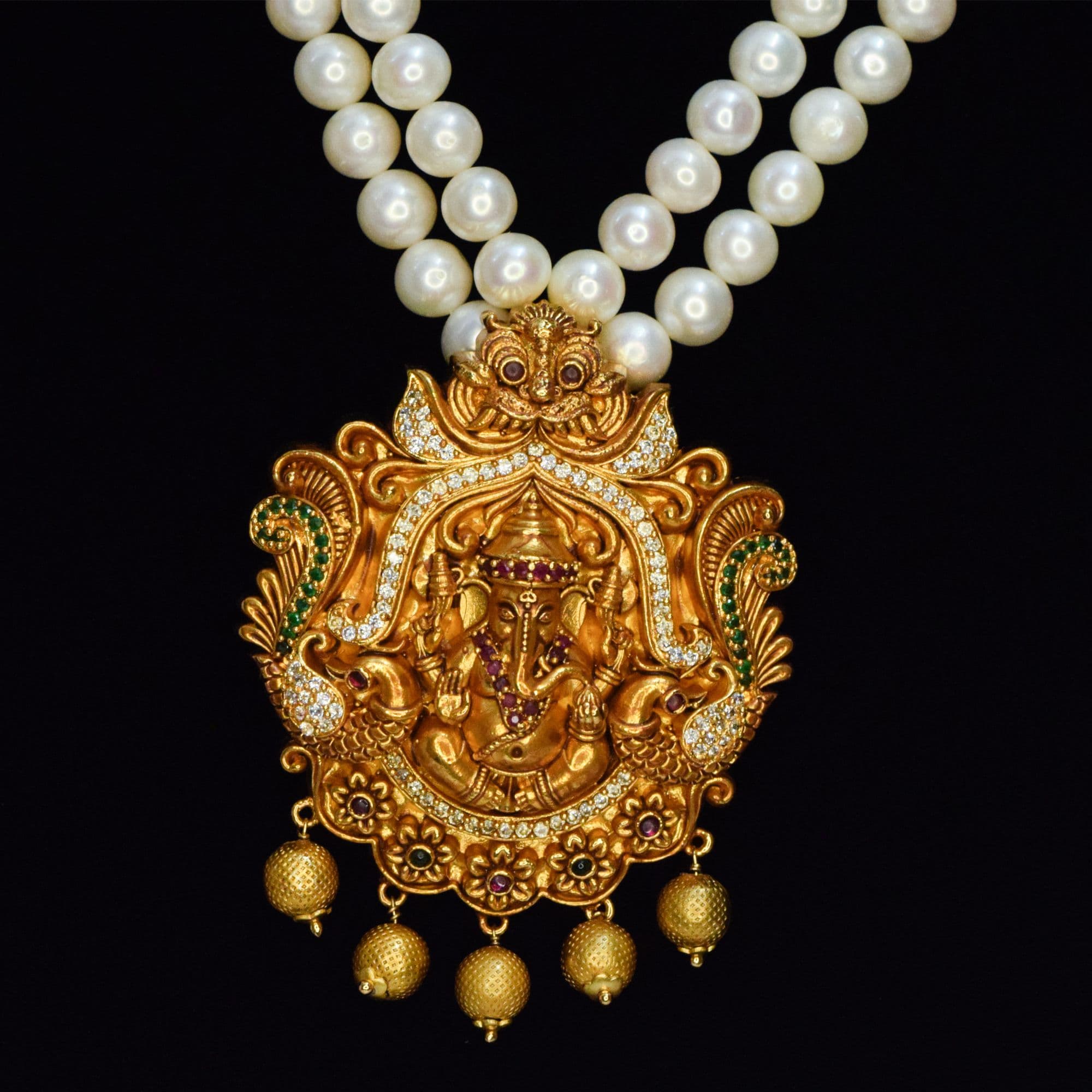 Magnificent golden finish Lord Ganesha pendant strung onto two rows of stunning 7.5mm round white pearls necklace.